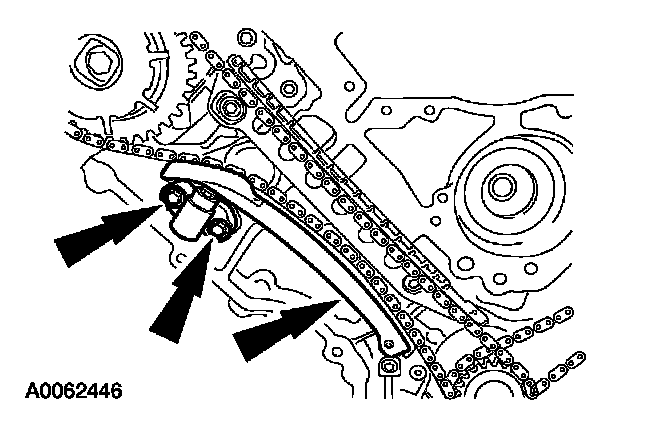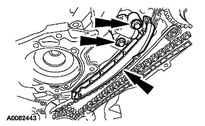 26. Position the RH timing chain tensioner arm on the dowel pin and install the RH timing chain tensioner and bolts.