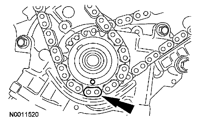 20. Position the lower end of the LH (inner) timing chain on the crankshaft sprocket, aligning the timing mark on the outer flange of the crankshaft sprocket with the single copper (marked) link on the chain.