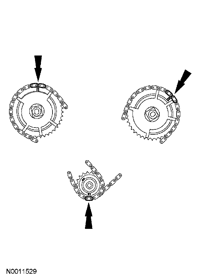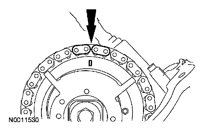 Position the RH timing chain on the camshaft sprocket. Make sure the camshaft sprocket timing mark is positioned between the two copper (marked) chain links.