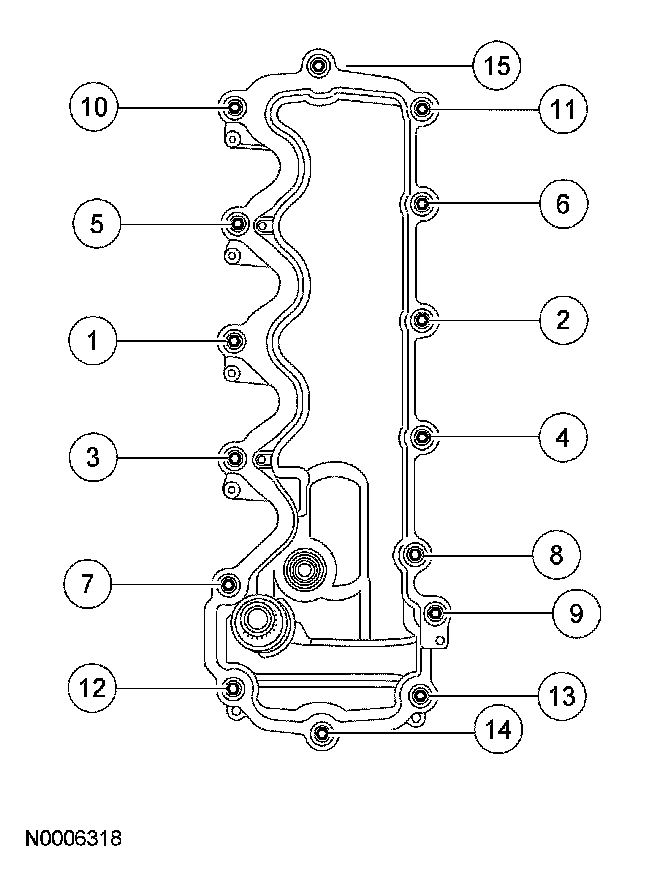 Stage 1: Tighten fasteners 1 through 15 to 25 Nm (18 ft. lbs.).