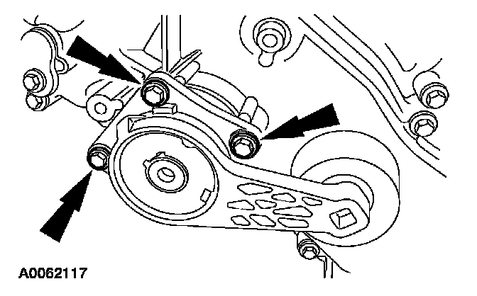 49. Position the accessory drive belt tensioner and install the 3 bolts.