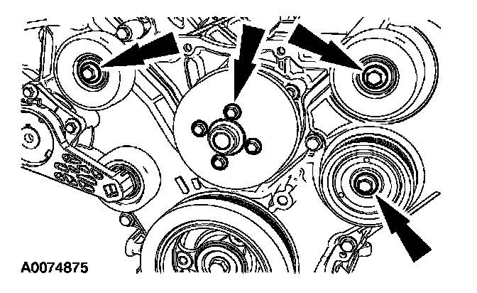 50. Install the 3 accessory drive belt idler pulleys, the coolant pump pulley and the 7 bolts.