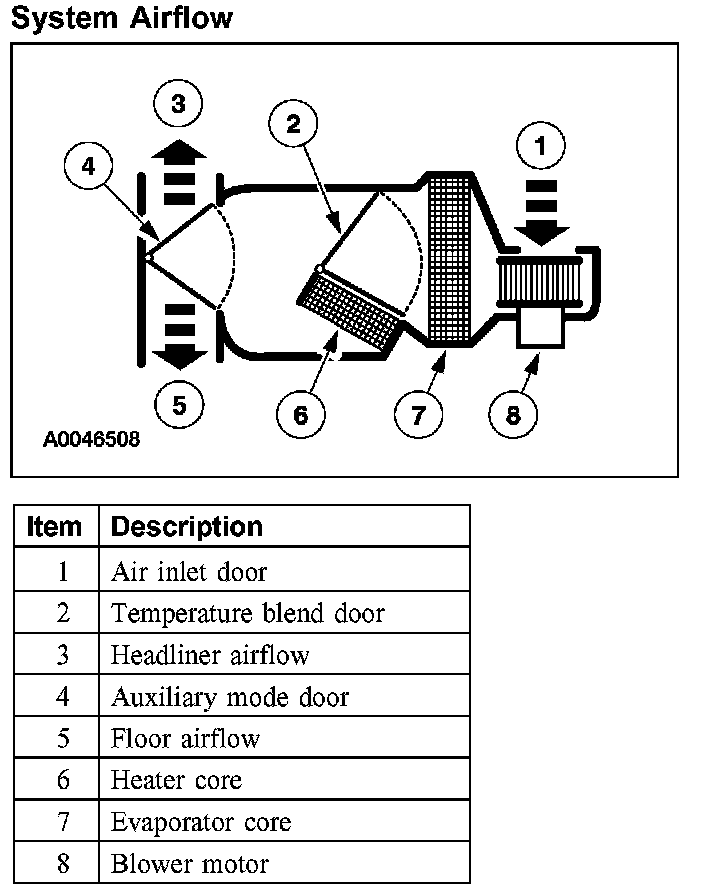 The evaporator core is an aluminum plate/fin type and is located in the auxiliary climate control housing. A mixture of refrigerant and oil enters the bottom of the evaporator core through the evaporator core inlet tube and then moves out of the evaporator core through the evaporator core outlet tube. When the A/C compressor is operating, air from the blower motor is cooled and dehumidified as it flows through the evaporator core fins.