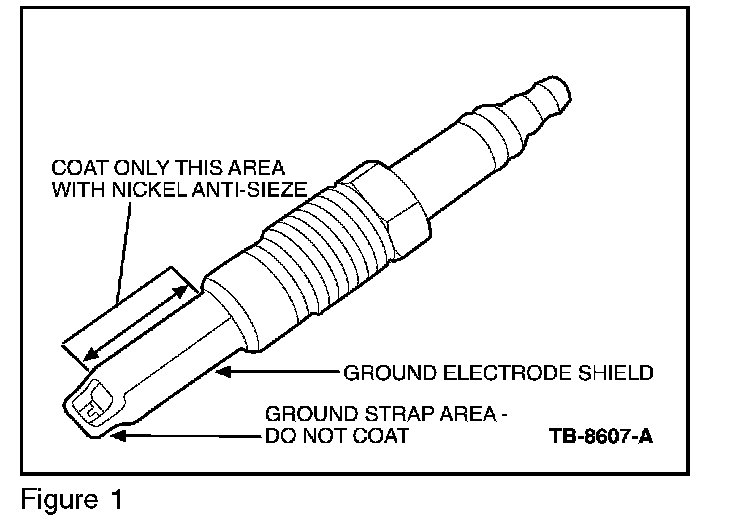 NEW PLUGS SHOULD BE INSTALLED USING A FILM COATING OF MOTORCRAFT HIGH TEMPERATURE NICKEL ANTI-SEIZE LUBRICANT ON THE GROUND ELECTRODE SHIELD. DO NOT COAT THE ELECTRODE STRAP. (Figure 1)