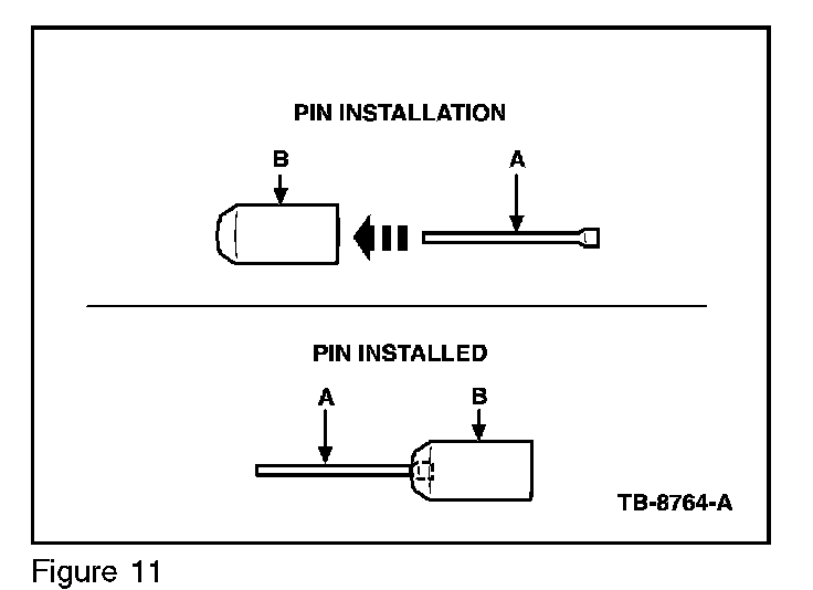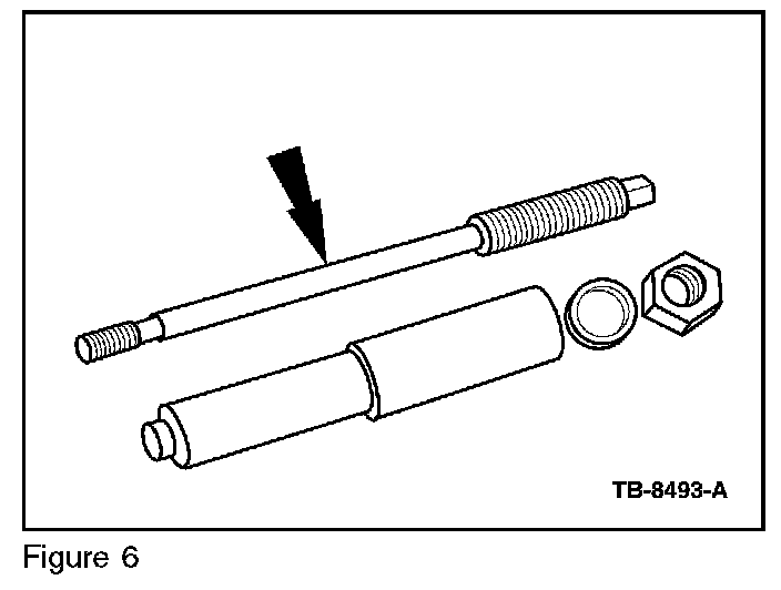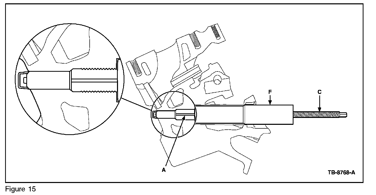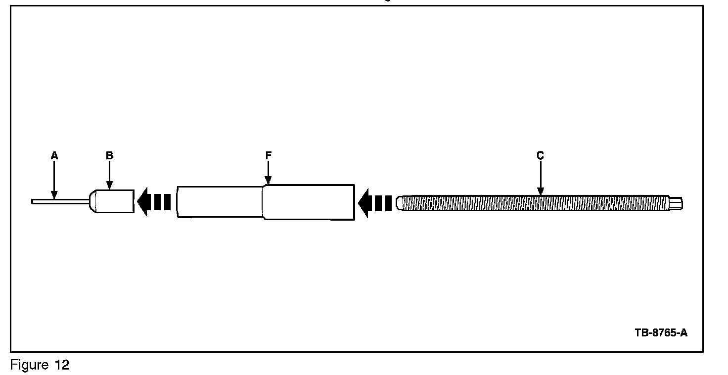 3. Insert a pin (A) into the collet (B). Screw the collet onto the threaded rod (C). Install the assembled collet, pin, and threaded rod into the steel tool pilot (F). (Figures 11 and 12)