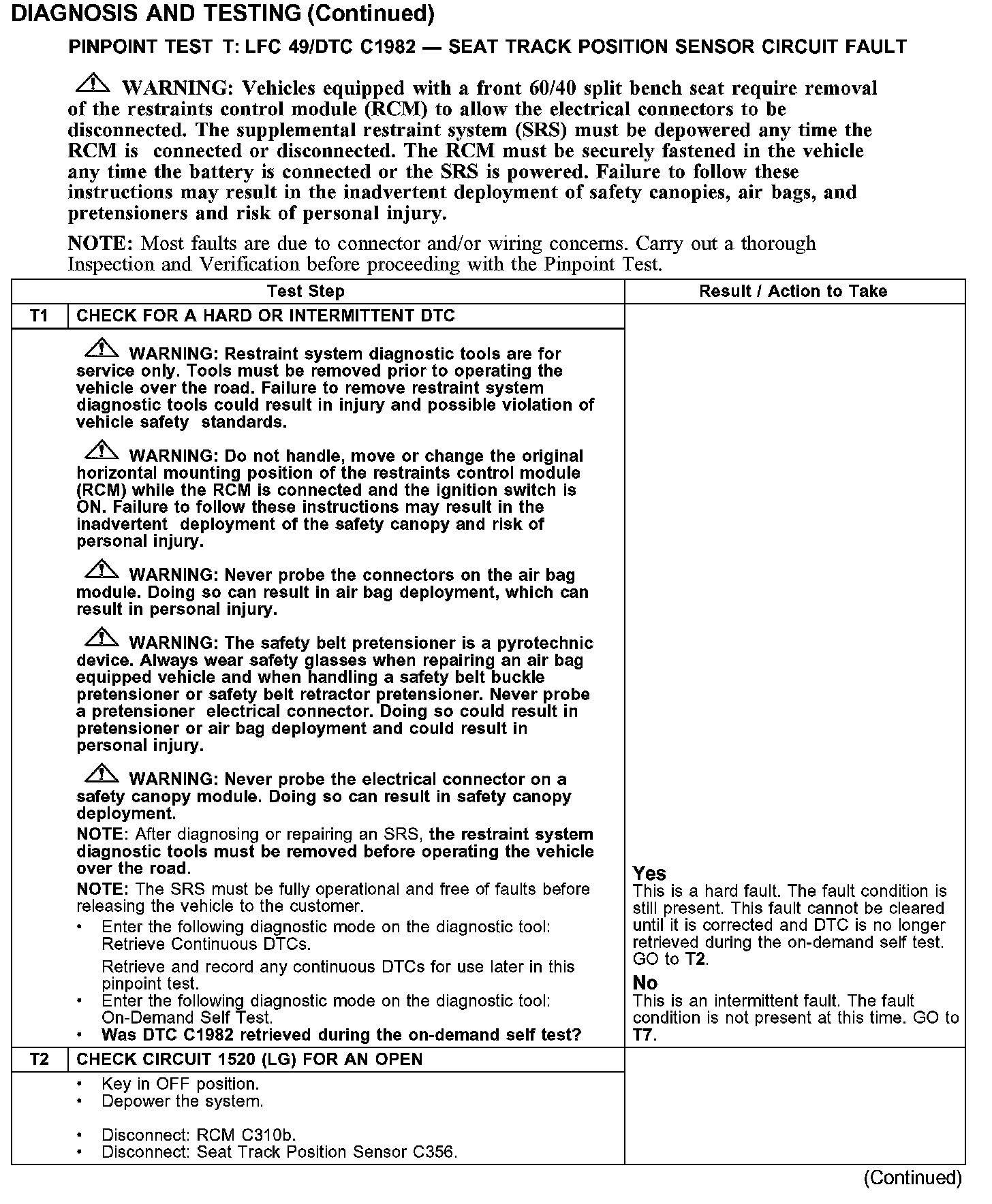 PINPOINT TEST T: LFC 49/DTC C1981 - SEAT TRACK POSITION SENSOR CIRCUIT FAULTT1-T2: