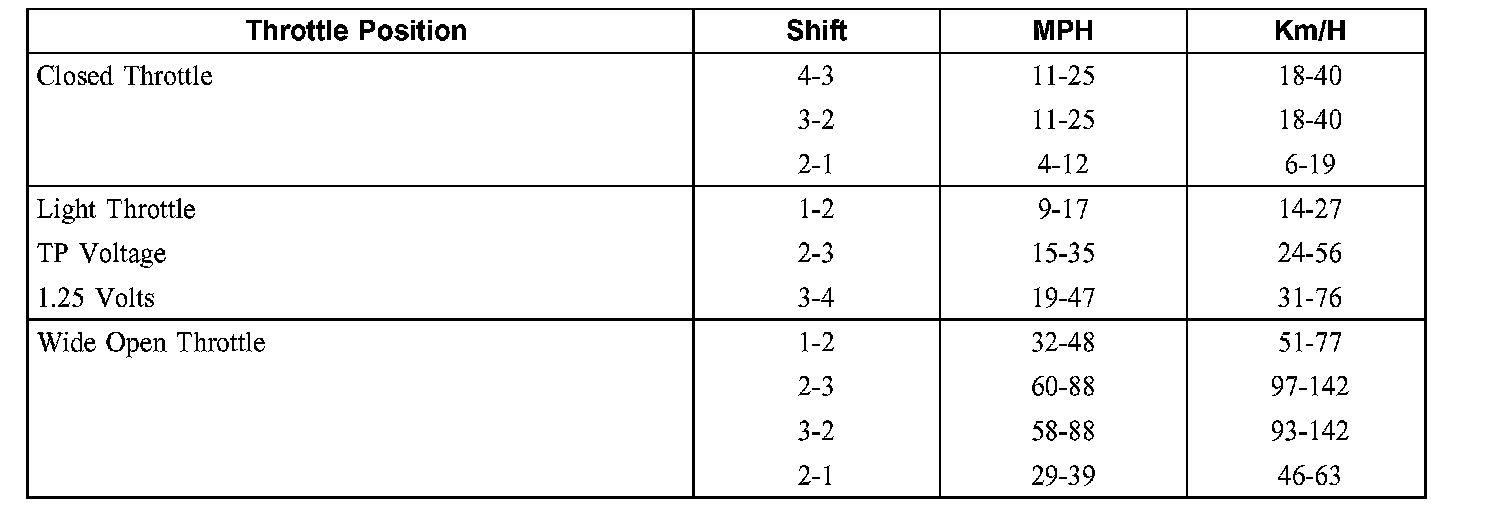 NOTE: Shift speed ranges are approximate for all applications. For specific applications (engine, axle ratio, tire size and application), refer to the Automatic Transmission Specifications. Specifications