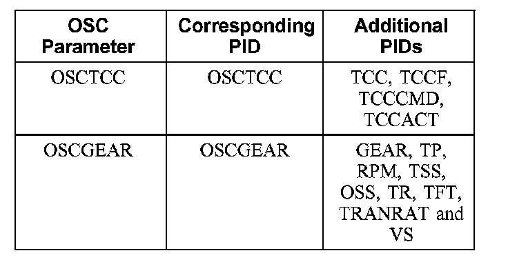 The vehicle requirements must be met when sending the OSC value for TCC. If the vehicle requirements are not met when sending the OSC value, an error message will appear. When the error message is received, OSC is aborted and must be restarted. After the OSC value for TCC is sent, if the vehicle requirements are no longer met, the error message will not appear but the OSC value will be canceled by the PCM (monitor corresponding PID). The OSC value XXX may be sent anytime to cancel OSC.