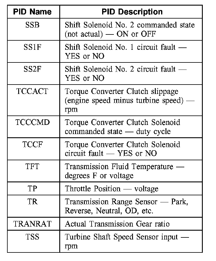 ^ TCC - Directs PCM to command the Torque Converter Solenoid OFF or ON (OFF = 0% duty cycle and ON = 100% duty cycle)