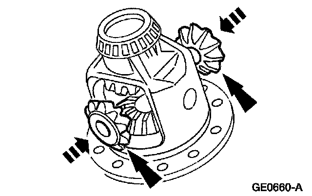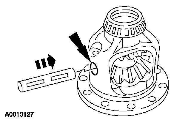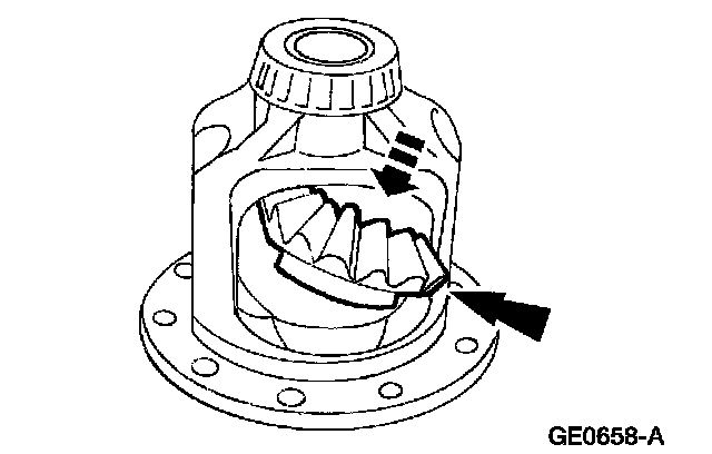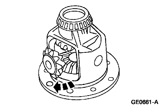 1 Rotate the differential pinion gears to the differential case window, and remove them.