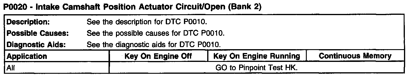 P0020 - Intake Camshaft Position Actuator Circuit/Open (Bank 2):