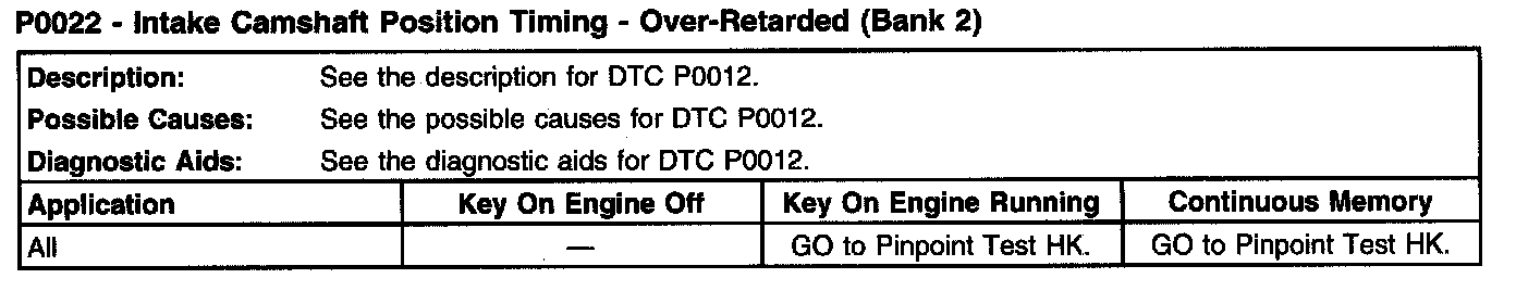 P0022 - Intake Camshaft Position Timing - Over-Retarded (Bank 2):