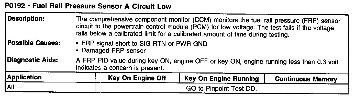 P0192 - Fuel Rail Pressure Sensor A Circuit Low: