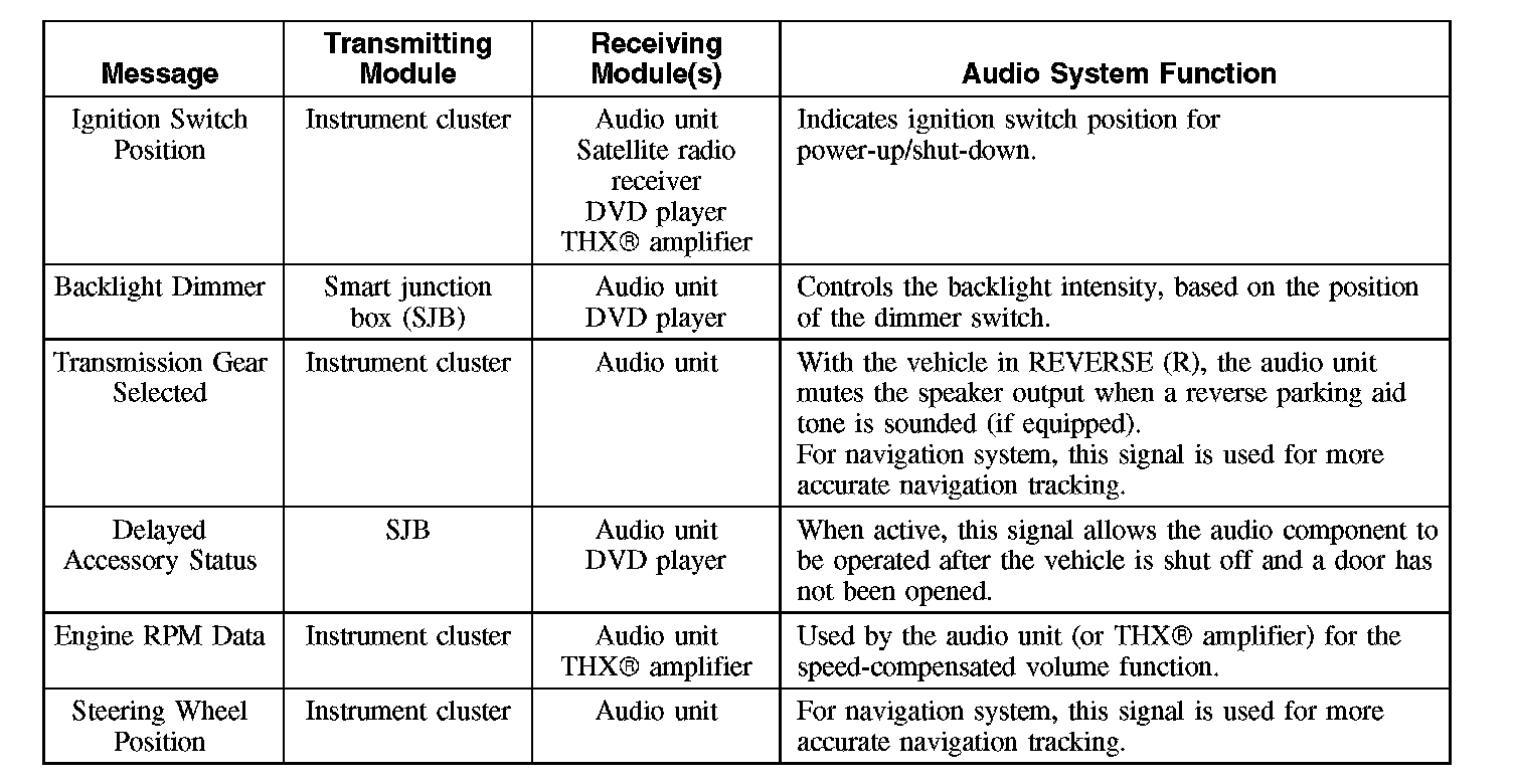 The audio unit can be operated while the key is in RUN or ACC. The accessory delay feature allows the audio unit and digital versatile disc (DVD) player to be operated for a preset period of time after the key is moved to OFF and a front door has not been opened. The audio unit sends AC voltage audio signals to the speakers or to the amplifier, depending on vehicle configuration. The audio unit can produce its own DTCs, which can be communicated to the scan tool through the medium speed controller area network (MS-CAN), or can be retrieved through the audio unit self-test by simultaneously pressing presets 3 and 6. The audio unit communicates via the MS-CAN.