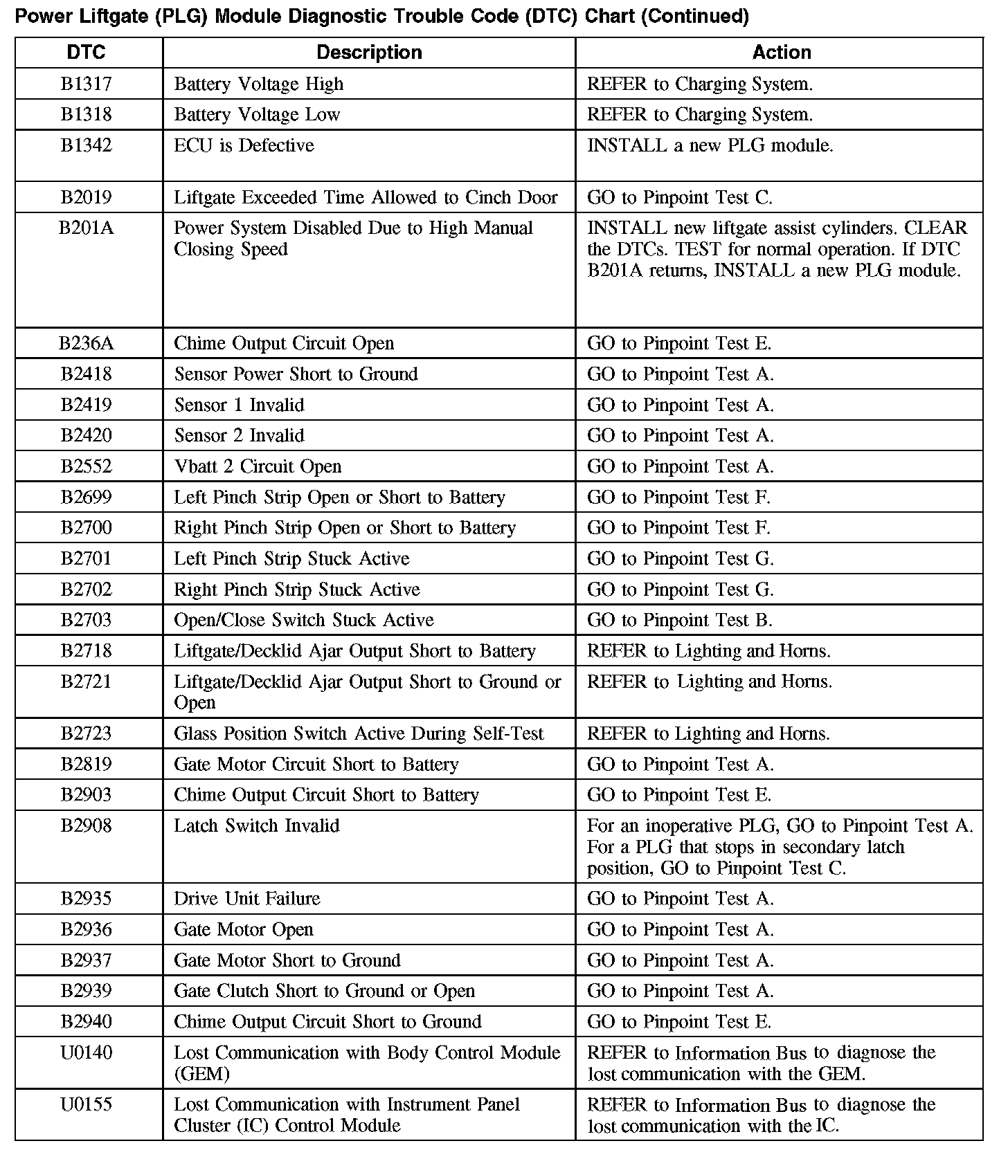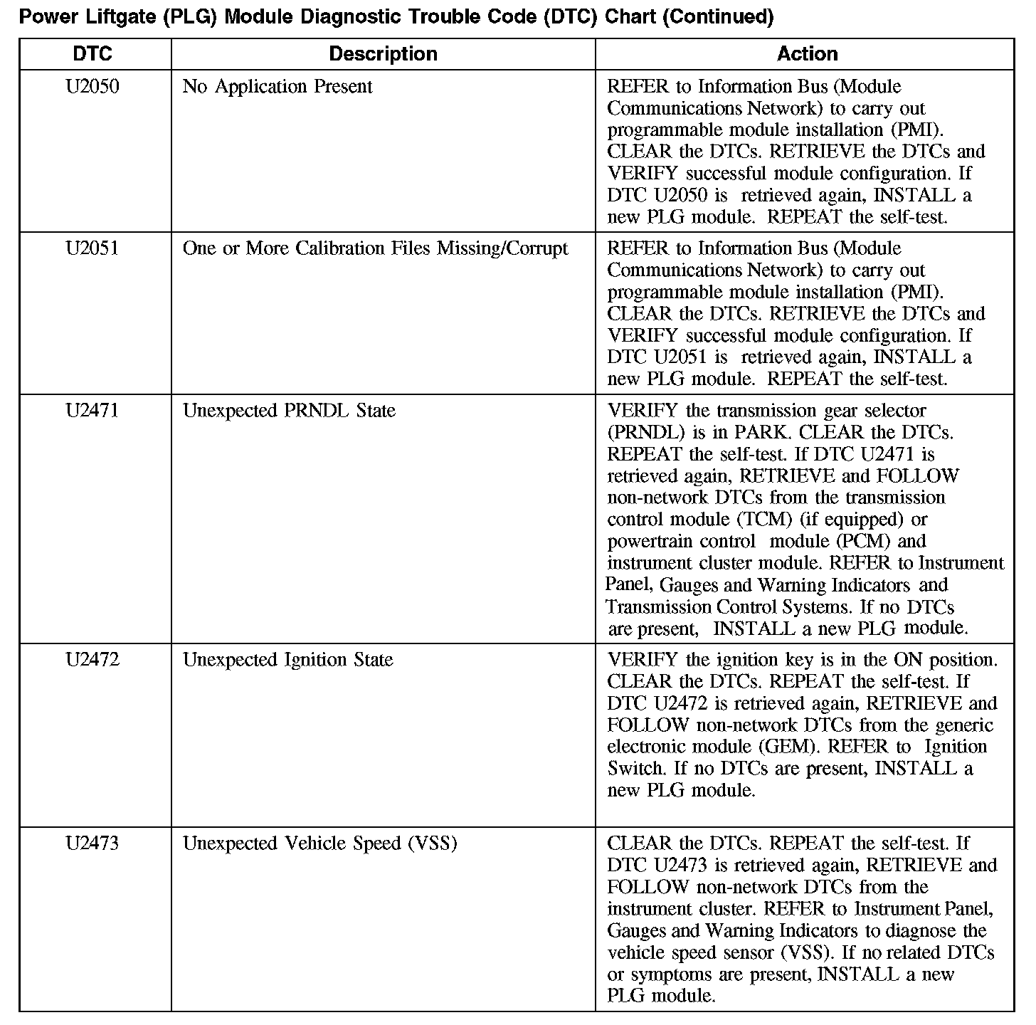 Power Liftgate (PLG) Module Diagnostic Trouble Code (DTC) Chart