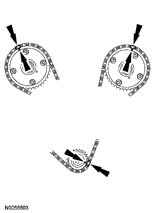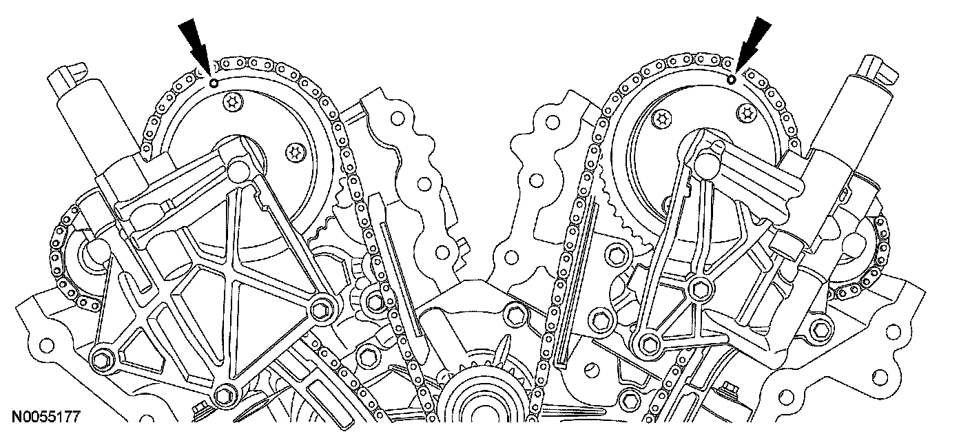 4. Install the primary timing chain with the colored links aligned with the timing marks on the VCT assemblies and the crankshaft sprocket.