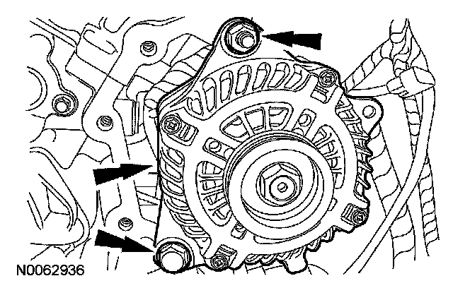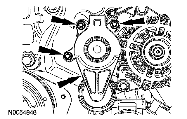 47. Remove the 3 bolts and the accessory drive belt tensioner.