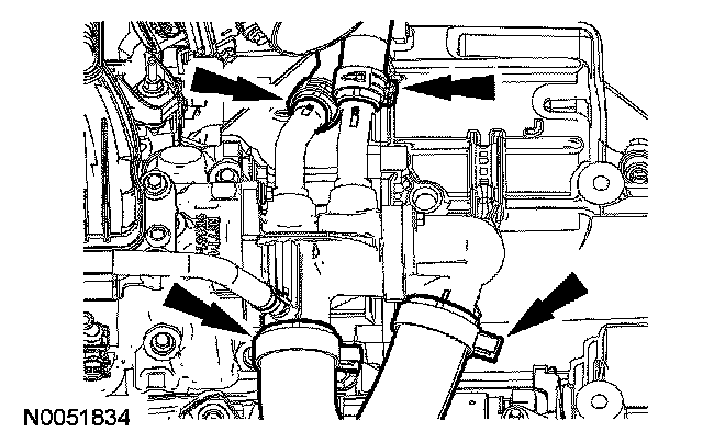 15. Disconnect the upper radiator hose, lower radiator hose and 2 heater hoses from the thermostat housing.