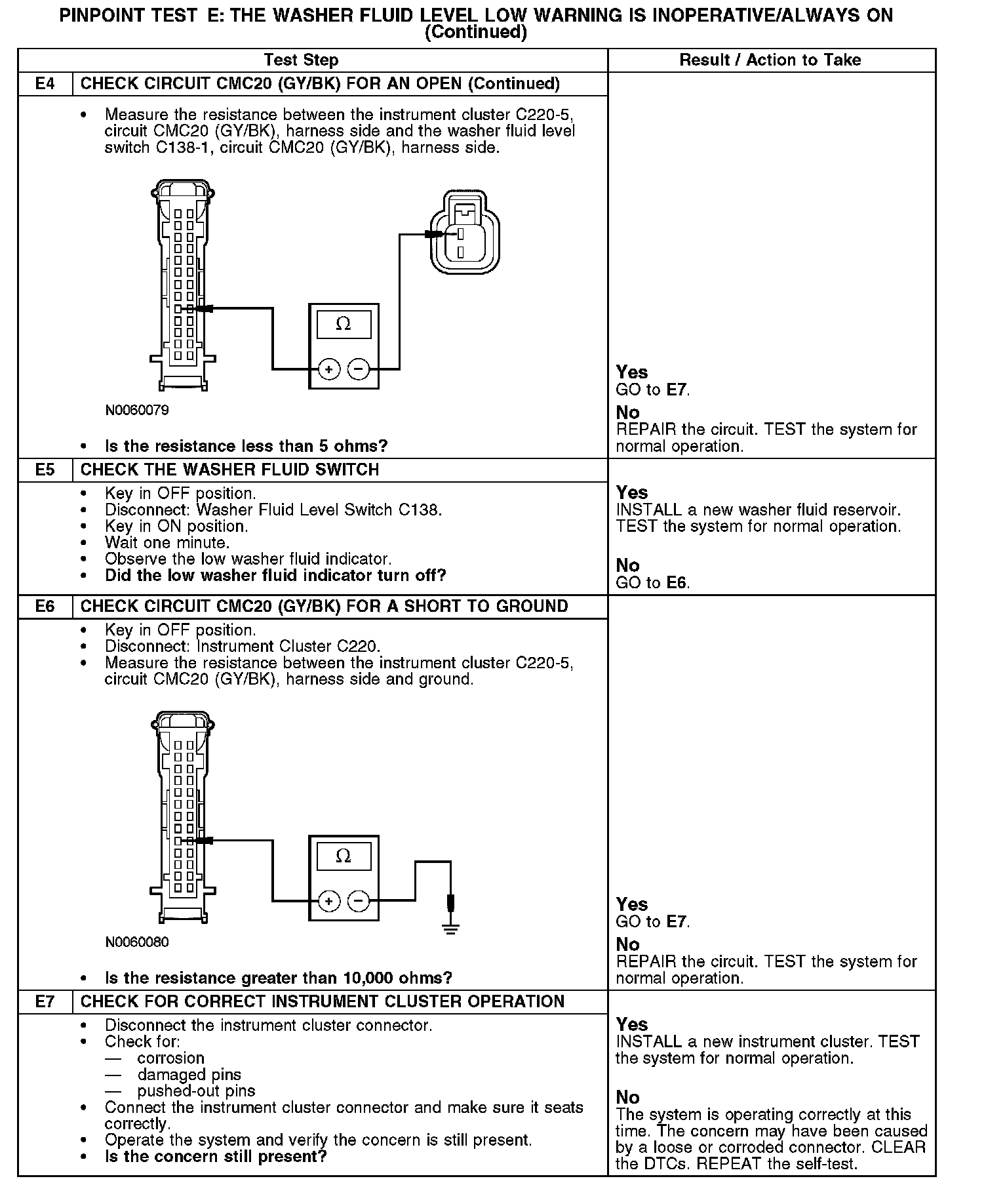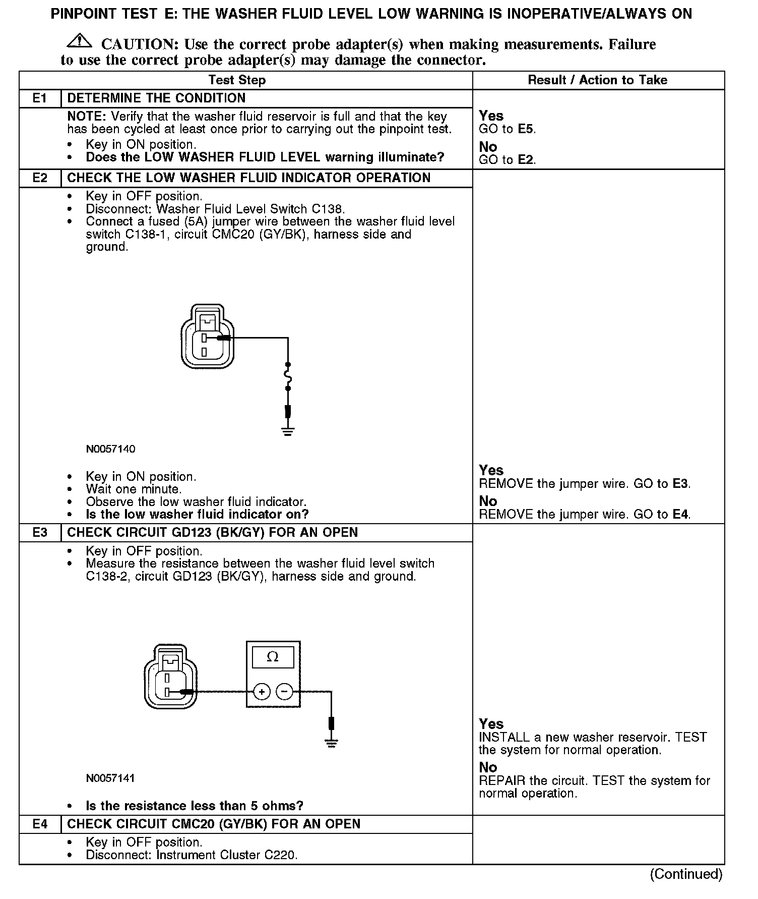 PINPOINT TEST E: THE WASHER FLUID LEVEL LOW WARNING IS INOPERATIVE/ALWAYS ONE1-E4: