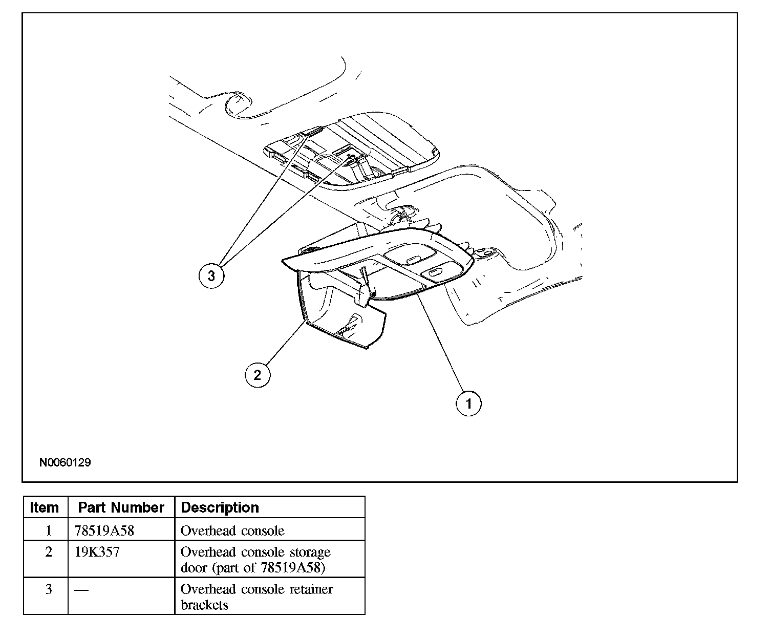 Pull the overhead console down and remove the console from the headliner retainer.