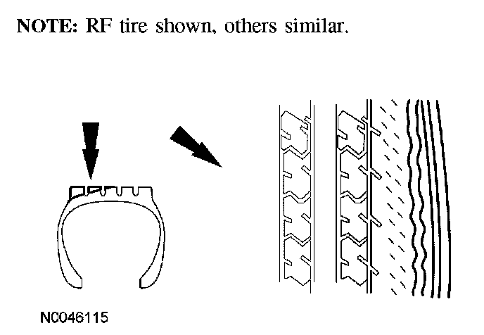 1. Inspect the tires for signs of uneven wear. Refer to these descriptions to identify the type of wear and the Symptom Chart for the appropriate repair action to be carried out. Symptom Related Diagnostic Procedures