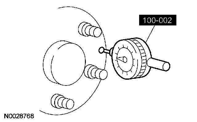 1. Position the special tool perpendicular to the wheel hub bolt, as close to the hub face as possible. Zero the indicator to allow the pointer to deflect either way.