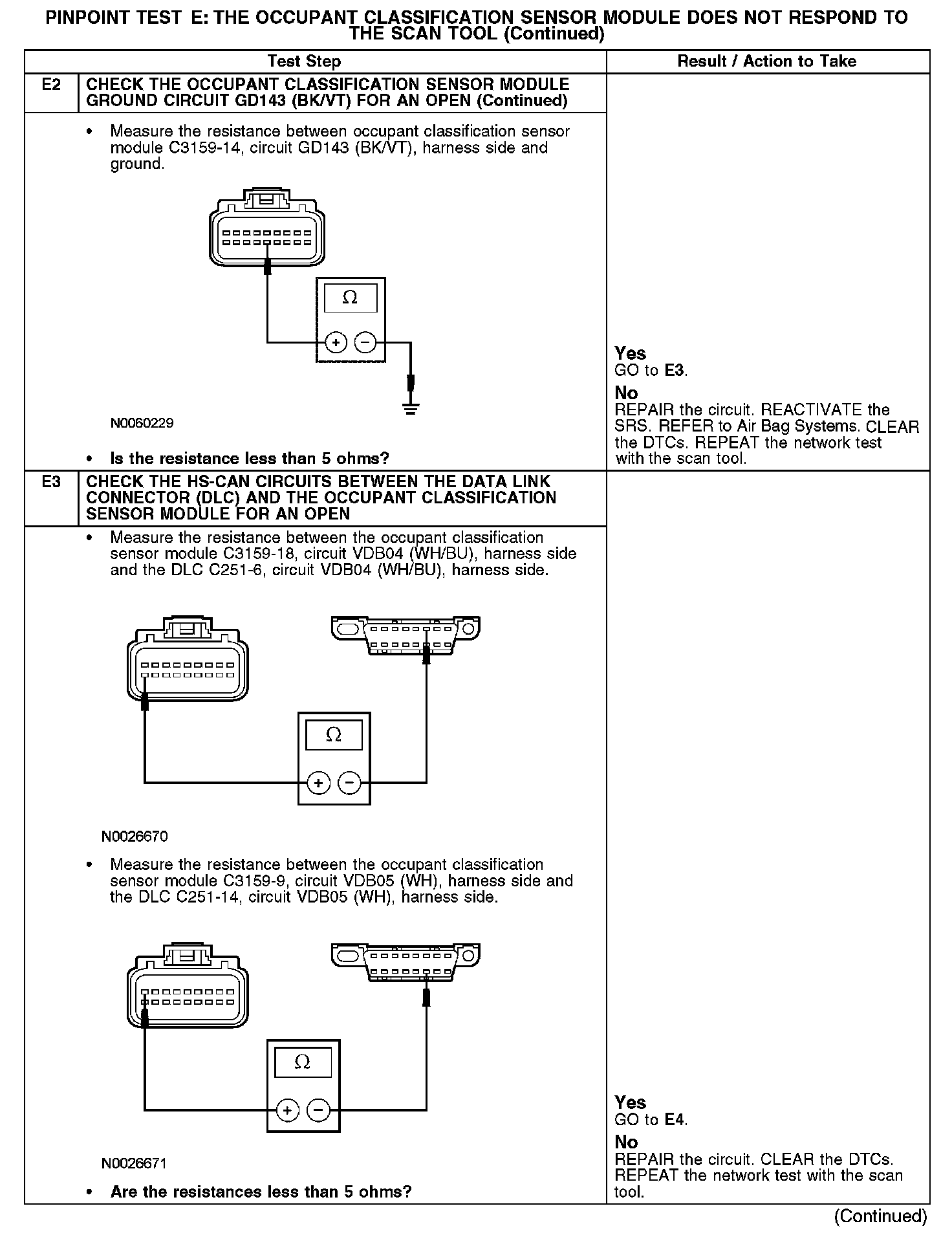 PINPOINT TEST E: THE OCCUPANT CLASSIFICATION SENSOR MODULE DOES NOT RESPOND TO THE SCAN TOOLE1-E2: