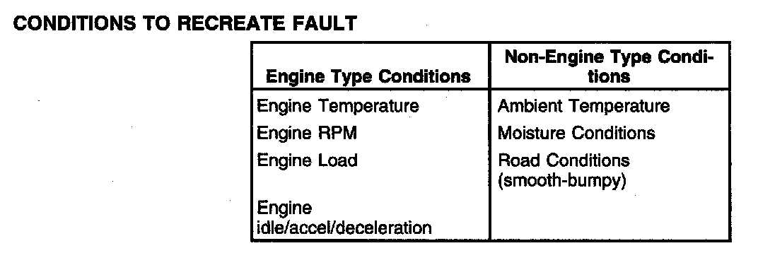 Recreating the concern is the first step in isolating the cause of the intermittent symptom. A thorough investigation should start with the customer information worksheet. If freeze frame data is available, it may help in recreating the conditions at the time of a malfunction indicator lamp diagnostic trouble code (MIL DTC). Listed are some of the conditions for recreating the concern: