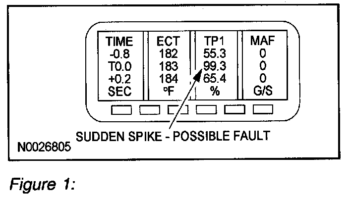 (Figure 1): Scroll through the PID data while analyzing the information. Look for sudden drops or spikes in the values. (Refer to the following TP1 example). Notice the major jump in the TP1 voltage while scrolling through the information. This example would require a smooth and progressive accelerator pedal travel during a key on and engine off mode.