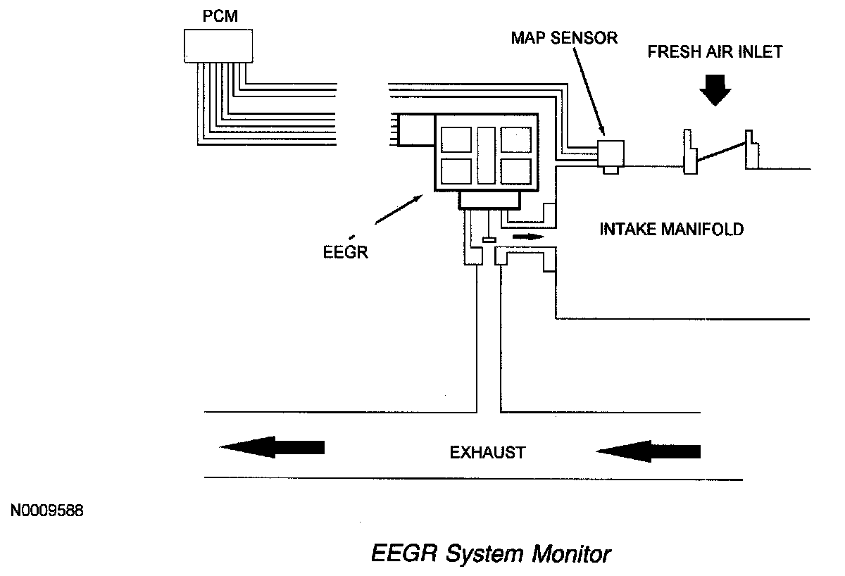The EEGR system monitor is an on-board strategy designed to test the integrity and flow characteristics of the EGR system. The monitor is activated during EGR system operation and after certain base engine conditions are satisfied. Inputs from the engine coolant temperature (ECT) or cylinder head temperature (CHT), intake air temperature (IAT), throttle position (TP), crankshaft position (CKP), mass air flow (MAF), and manifold absolute pressure (MAP) sensors are required to activate the EGR system monitor. Once activated, the EGR system monitor carries out each of the tests described below during the engine modes and conditions indicated. Some of the EGR system monitor tests are also carried out during a key on engine off (KOEO) or key on engine running (KOER) self-test.