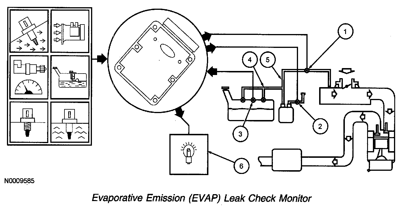 4. The EONV EVAP leak check monitor uses the naturally occurring change in fuel tank pressure as a means to detect a leak in the EVAP system. At key off, a target pressure and vacuum is determined by the PCM. These target values are based on the fuel level and the ambient temperature at key off. As the fuel tank temperature increases, the pressure in the tank increases and as the temperature decreases a vacuum develops. If a leak is present in the EVAP system the fuel tank pressure or vacuum does not exceed the target value during the testing time period. The EONV EVAP leak check monitor begins at key off.