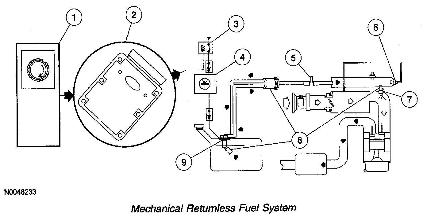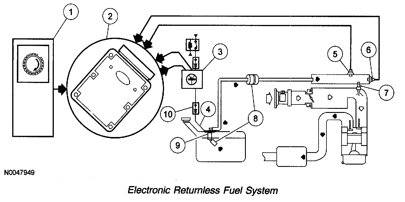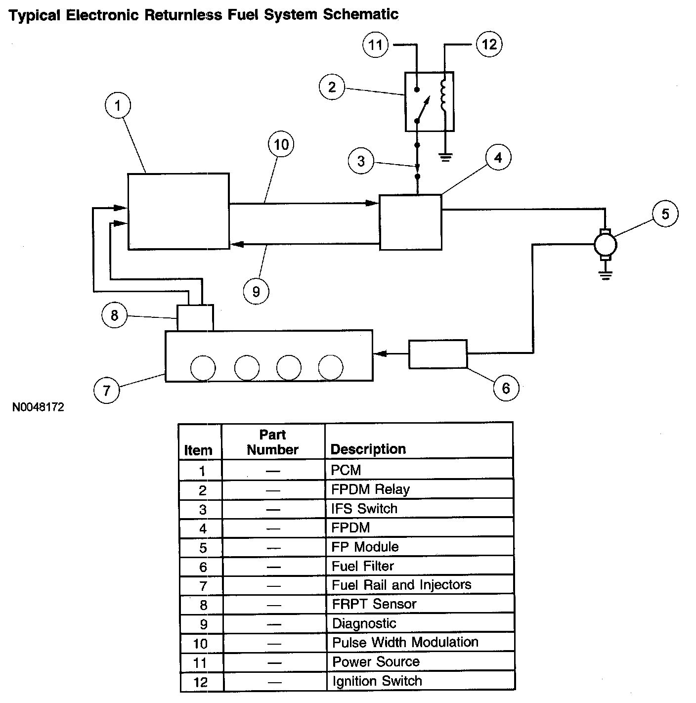 The electronic returnless fuel system consists of a fuel tank with reservoir, the fuel pump, the fuel rail pressure (FRP) or fuel rail pressure temperature (FRPT) sensor, the fuel filter, the fuel supply line, the fuel rail, and the fuel injectors. Operation of the system is as follows: