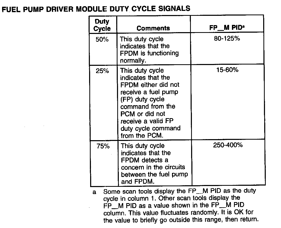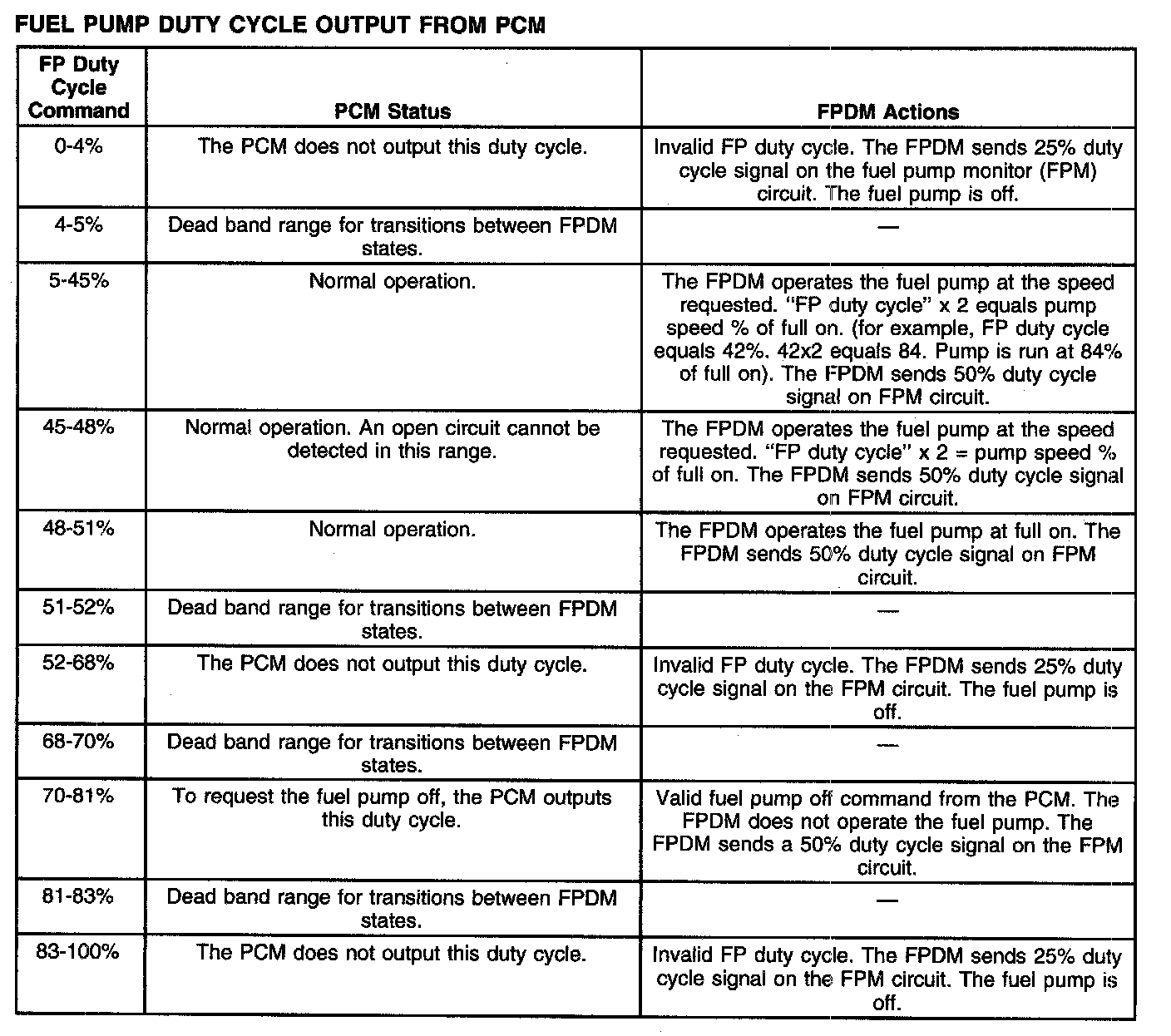 The FPDM communicates diagnostic information to the PCM through the FPM circuit This information is sent by the FPDM as a duty cycle signal. The 3 duty cycle signals that may be sent are listed in the table.