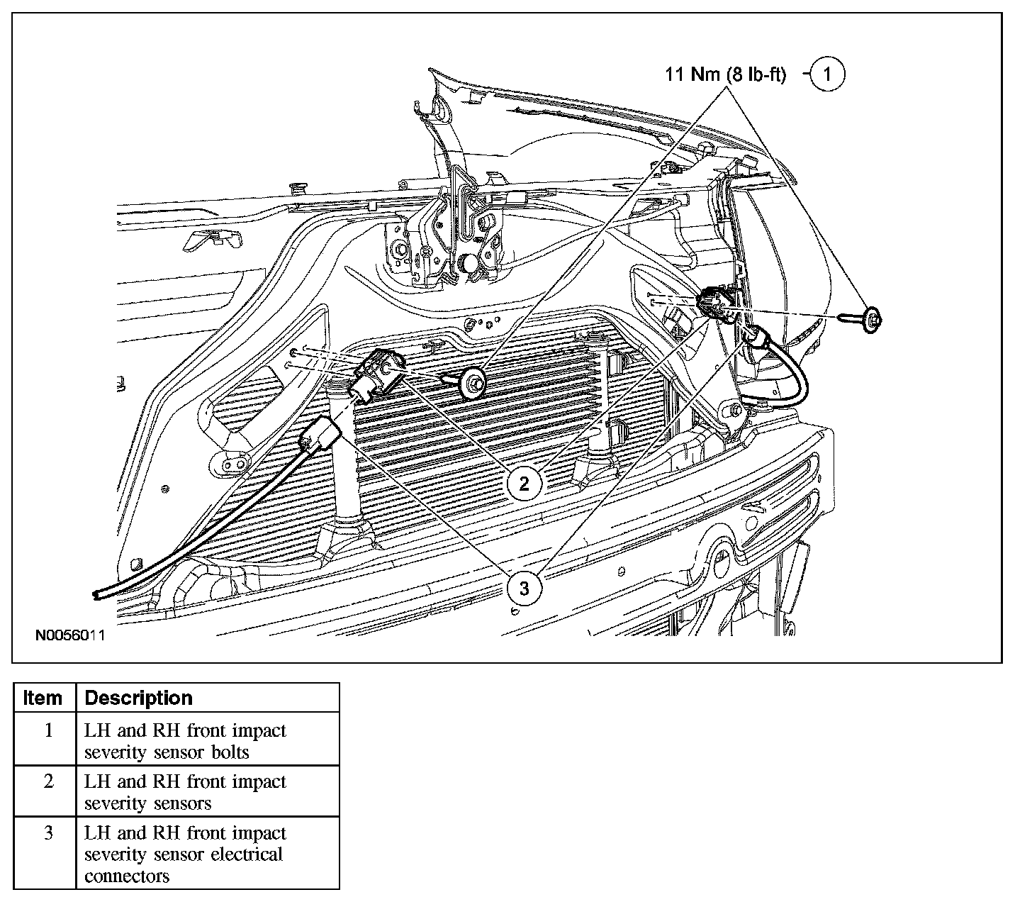 4. WARNING: The tightening torque of the front impact severity sensor retaining nuts is critical for correct system operation. Failure to follow tightening instructions may result in serious personal injury.