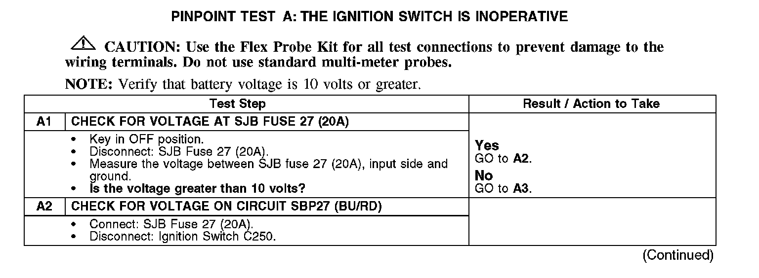 PINPOINT TEST A: THE IGNITION SWITCH IS INOPERATIVE