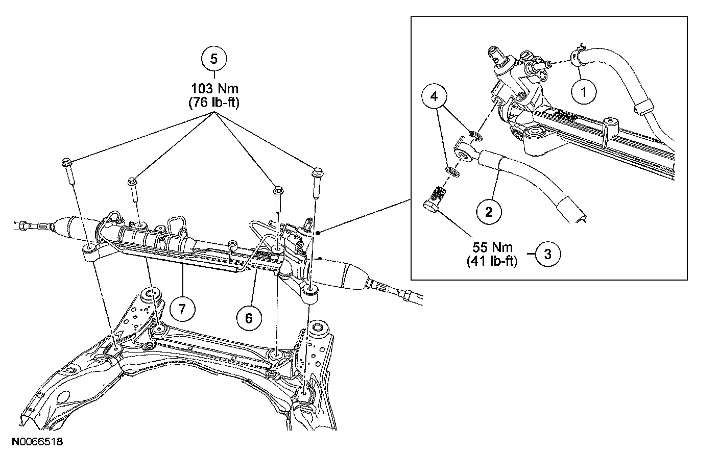 1. Position the steering gear and tighten the 4 steering gear bolts to 103 Nm (76 ft. lbs) in the sequence shown.