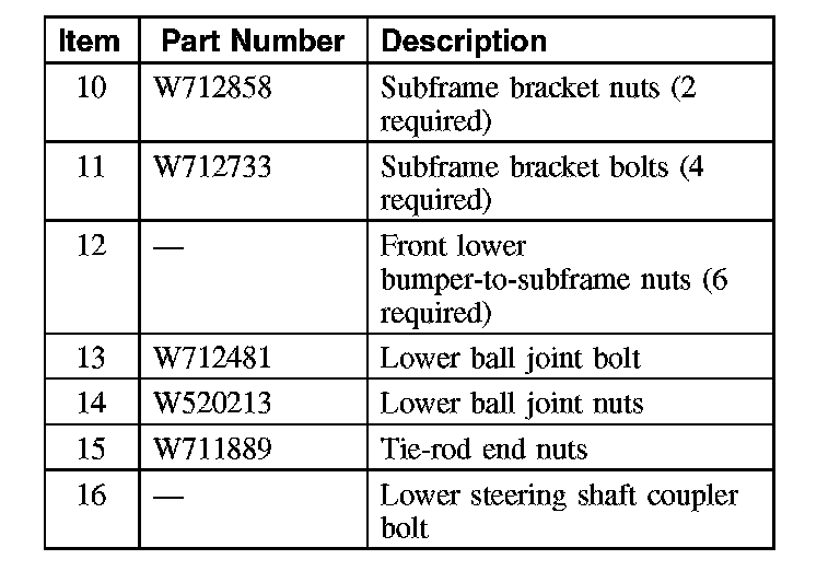 CAUTION: Suspension and subframe fasteners are critical parts because they affect performance of vital parts and systems and their failure can result in major service expense. A new part with the same part number must be installed if installation becomes necessary. Do not use a replacement part of lesser quality or substitute design. Torque values must be used as specified during reassembly to make sure of correct retention of these parts.