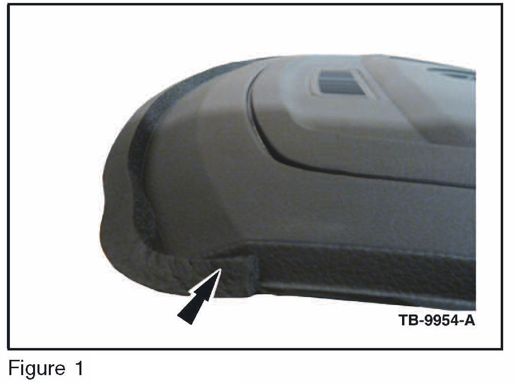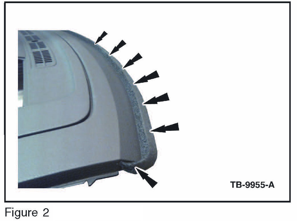 6. Apply the remaining length of the foam seal along the forward most edge of the IP following the ungrained portion of the IP and making sure that force is applied evenly along the entire length of the IP. At the driver's side of the IP, wrap the remaining foam seal around corner and press firmly into place. (Figure 2)