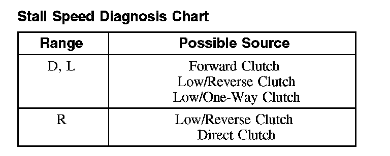 If stall speeds were too high, refer to the Stall Speed Diagnosis Chart. If stall speeds were too low, first check engine idle speed and tune up. If engine is OK, remove torque converter and check torque converter clutch for slippage.