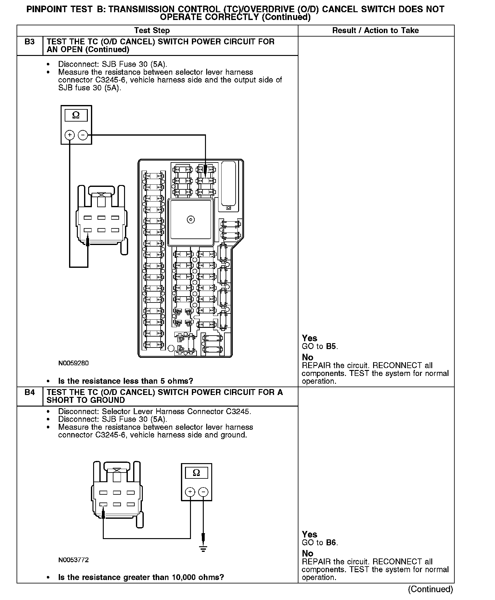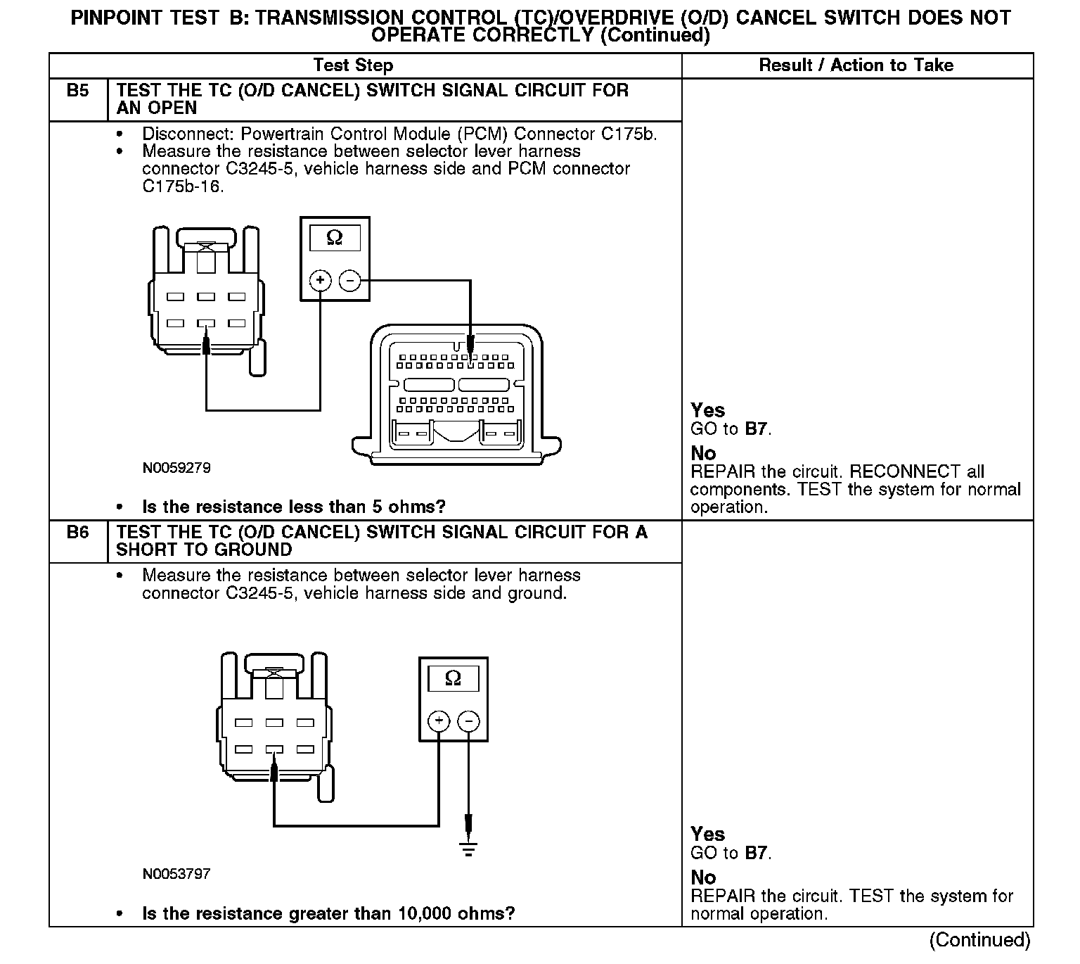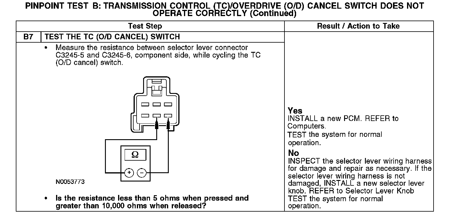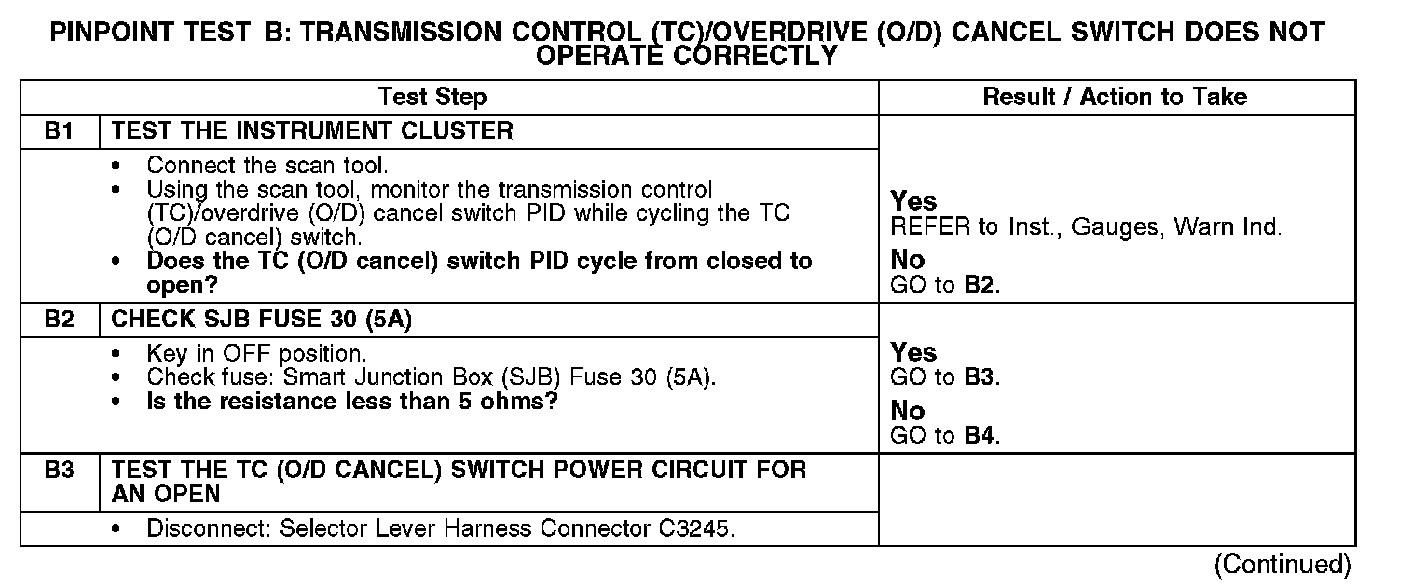 PINPOINT TEST B: TRANSMISSION CONTROL (TC)/OVERDRIVE (O/D) CANCEL SWITCH DOES NOT OPERATE CORRECTLY