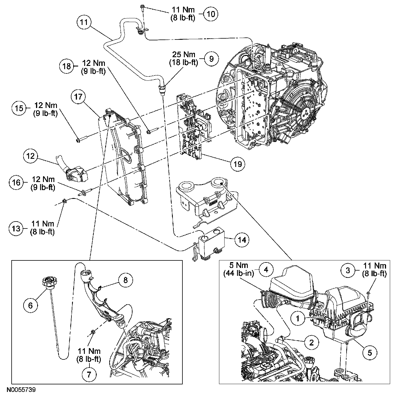 11. Position the transmission fluid cooler thermal bypass valve and transmission fluid cooler tube assembly in place and install the 2 nuts.