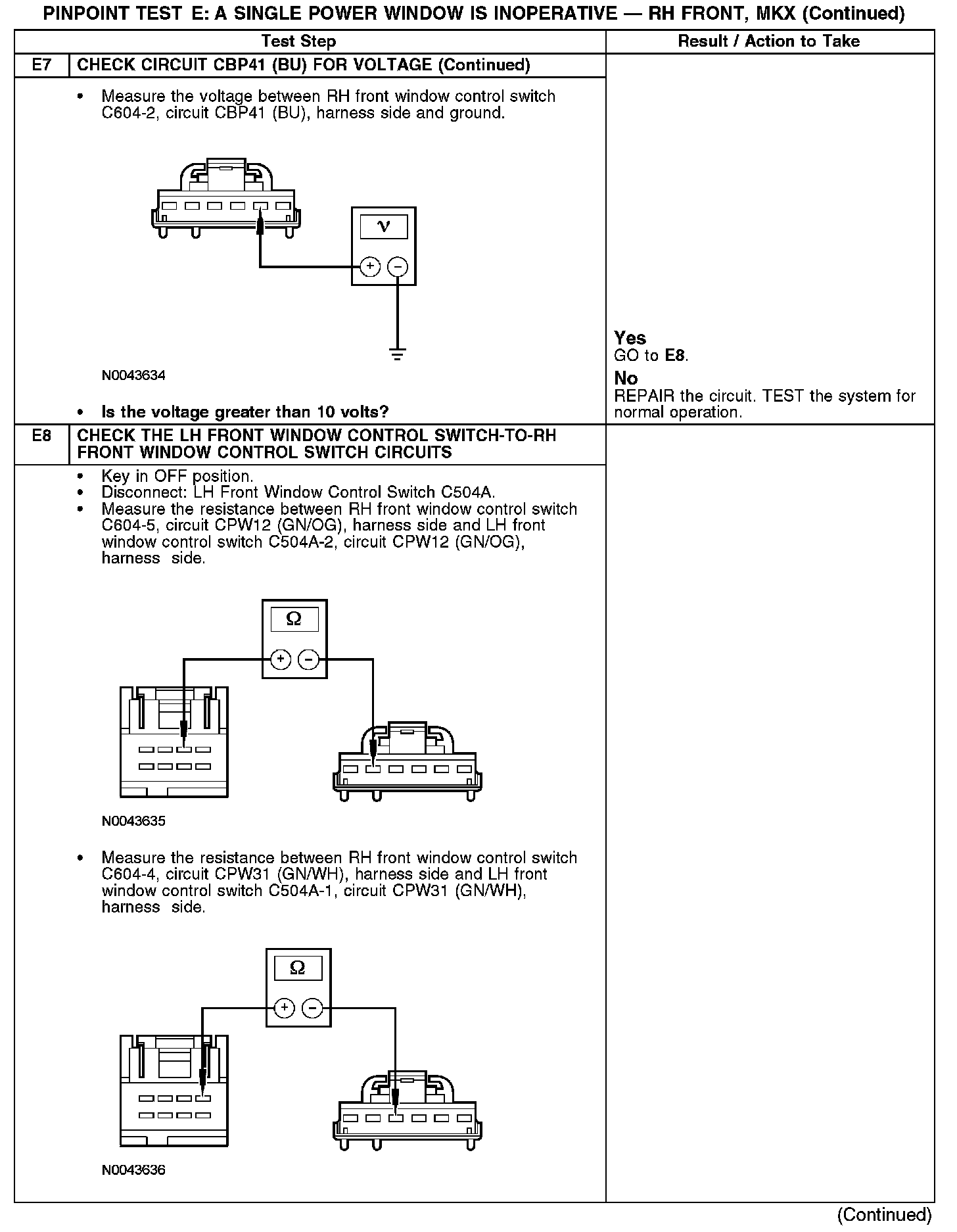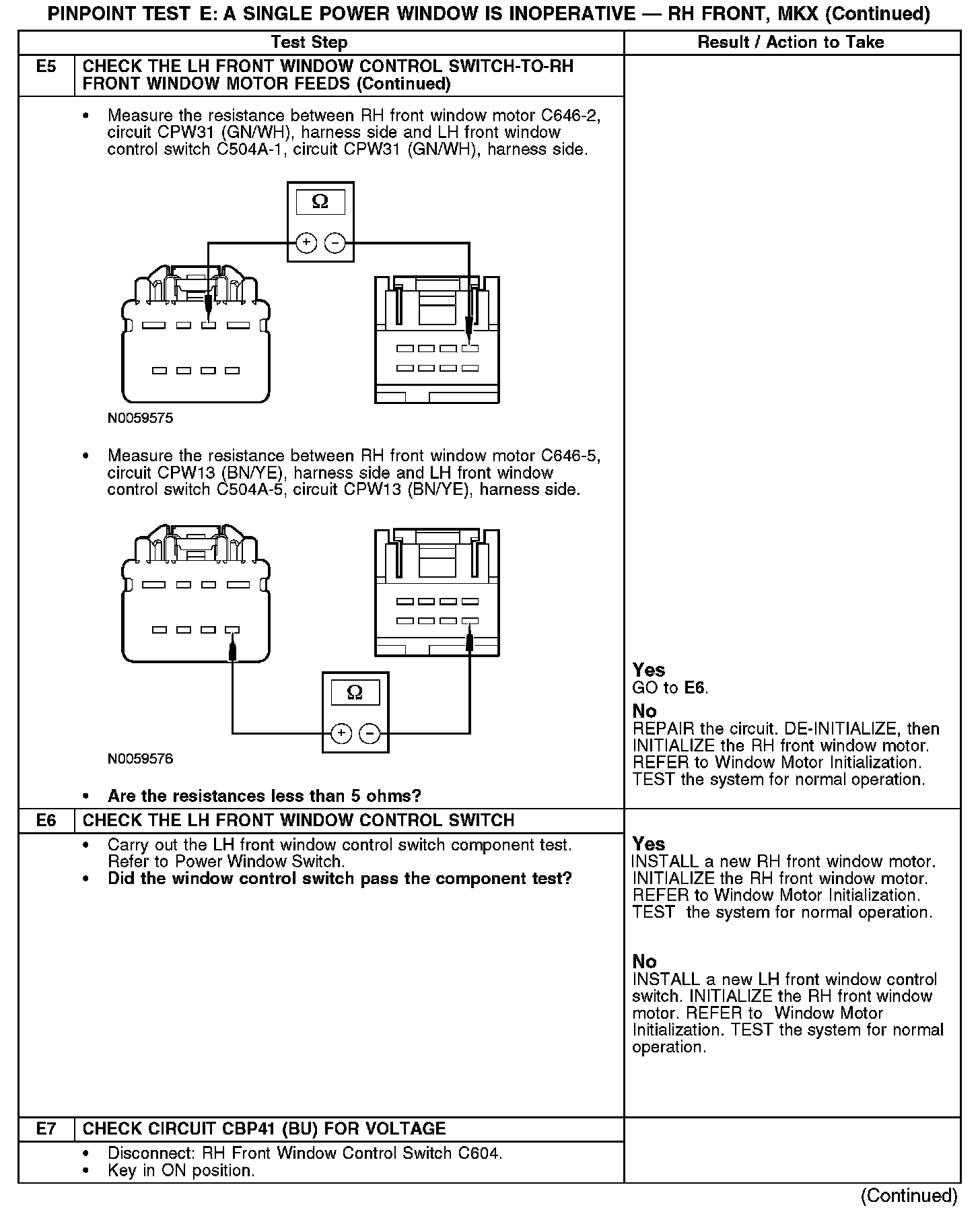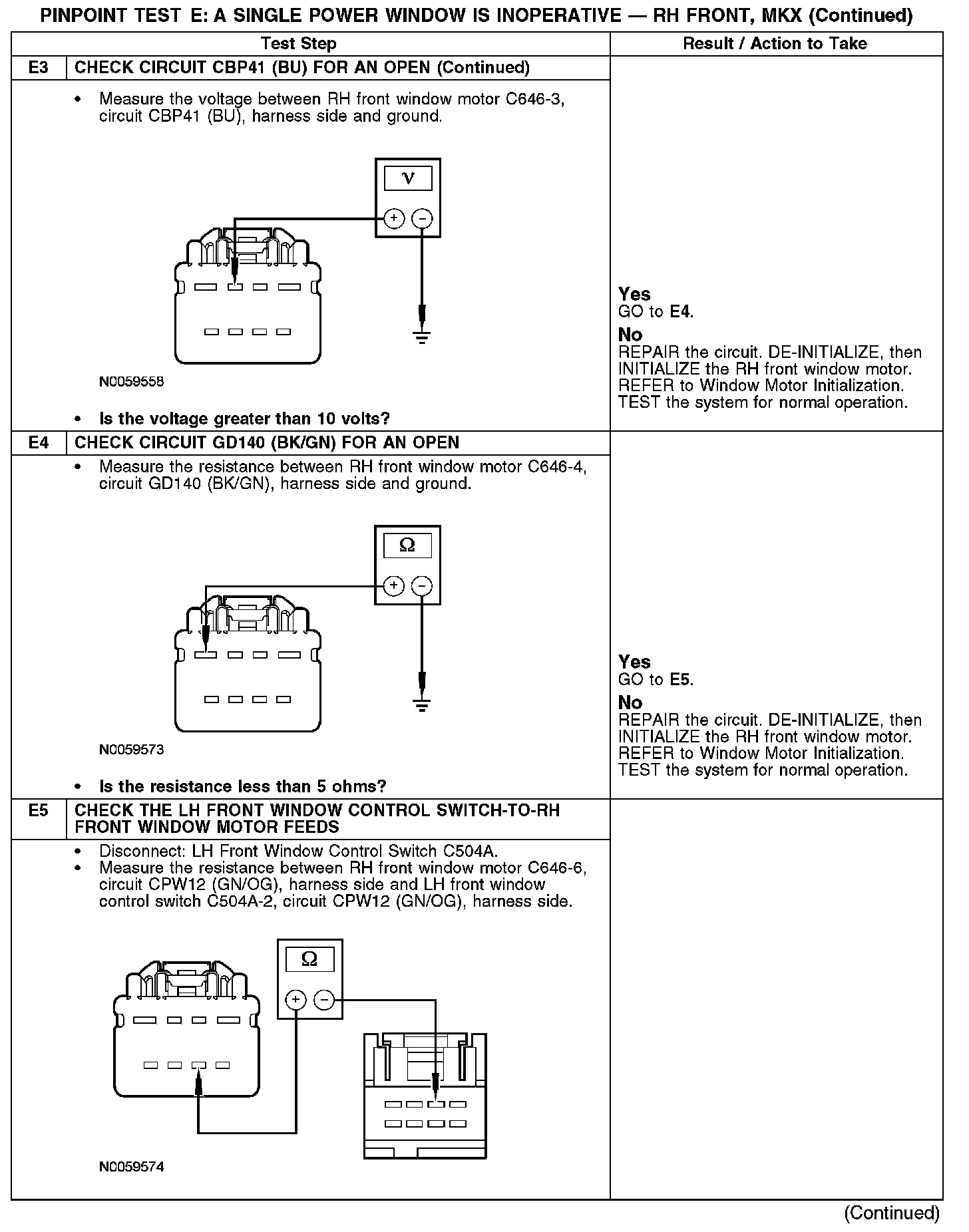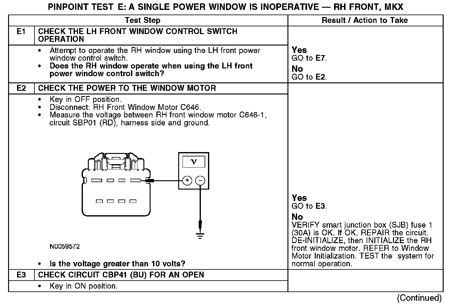 PINPOINT TEST E: A SINGLE POWER WINDOW IS INOPERATIVE - RH FRONT, MKXE1-E3: