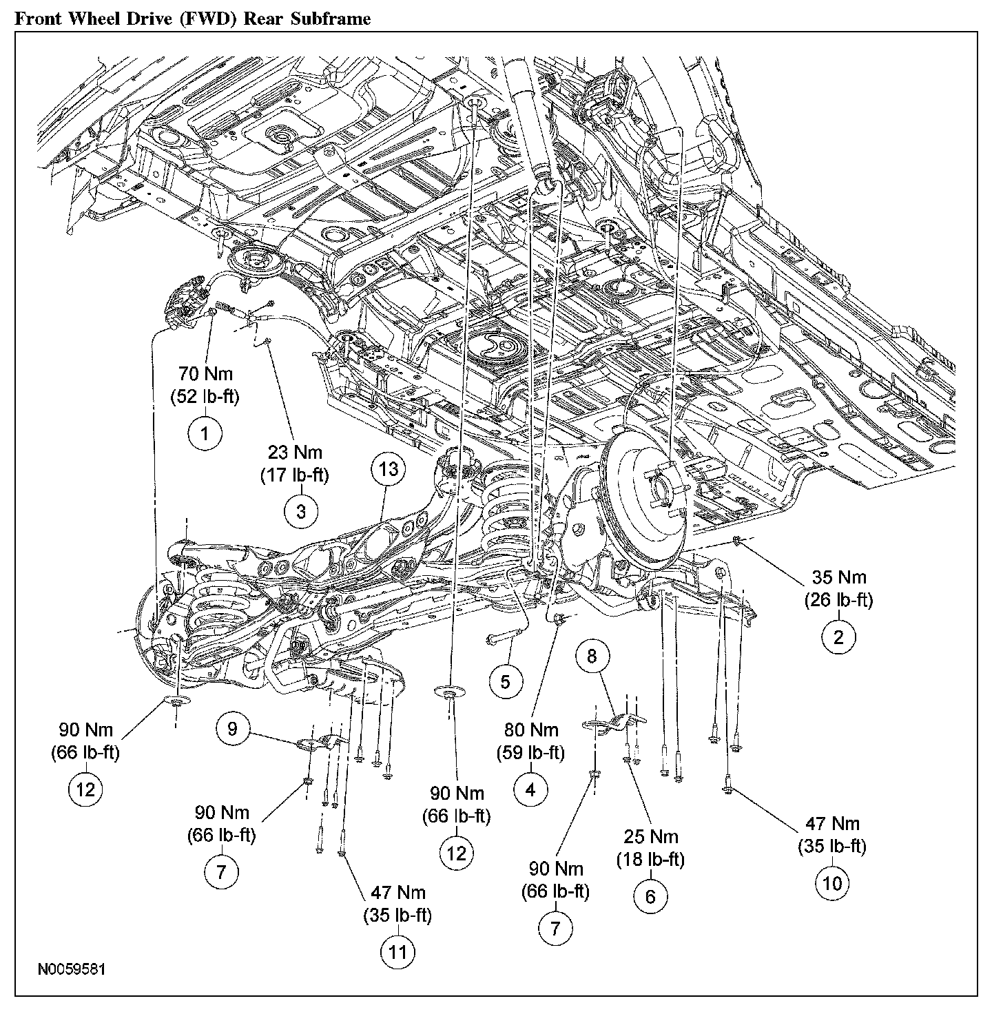 CAUTION: Suspension and subframe fasteners are critical parts because they affect performance of vital parts and systems and their failure may result in major service expense. A new part with the same part number must be installed if installation becomes necessary. Do not use a replacement part of lesser quality or substitute design. Torque values must be used as specified during reassembly to make sure of correct retention of these parts.