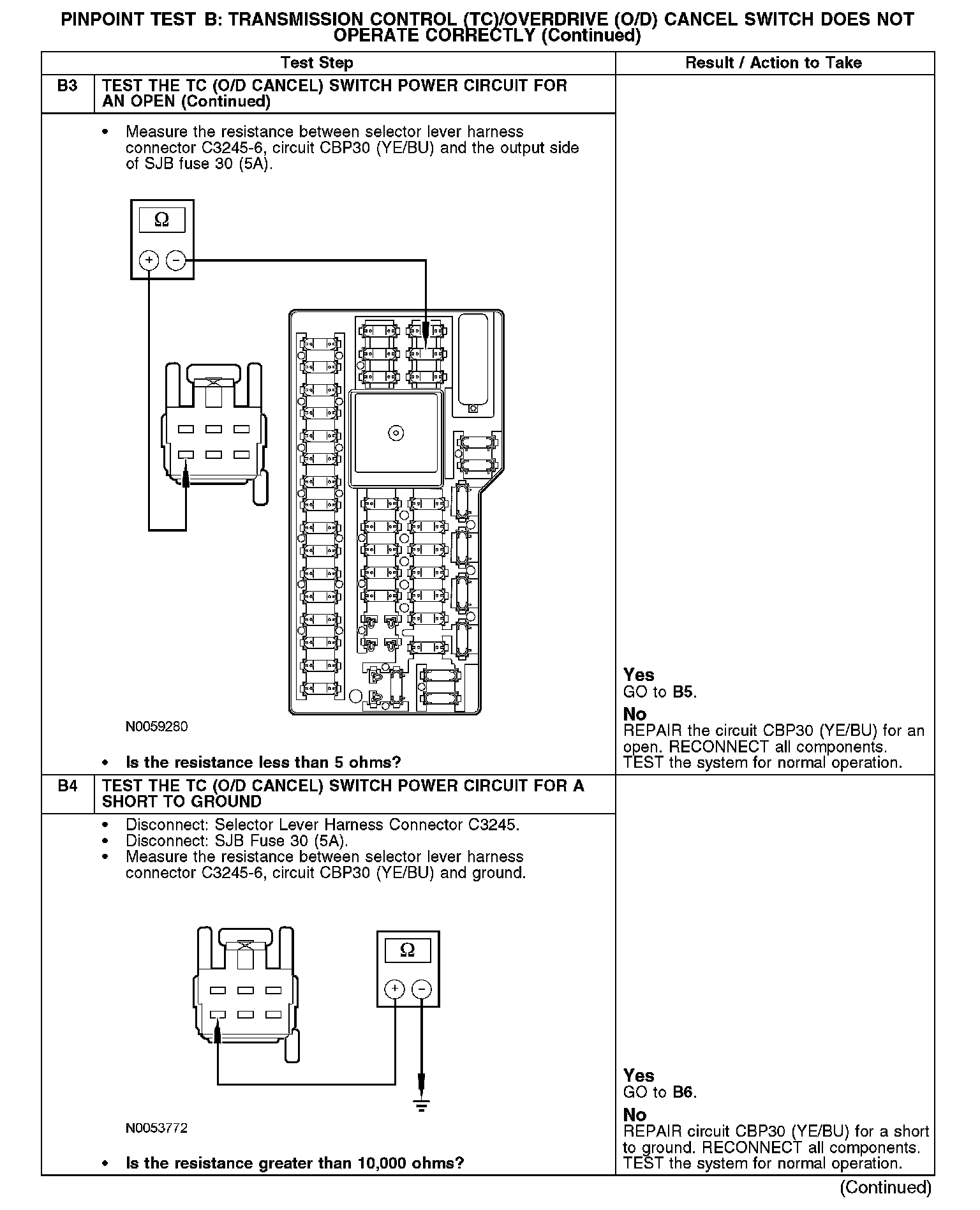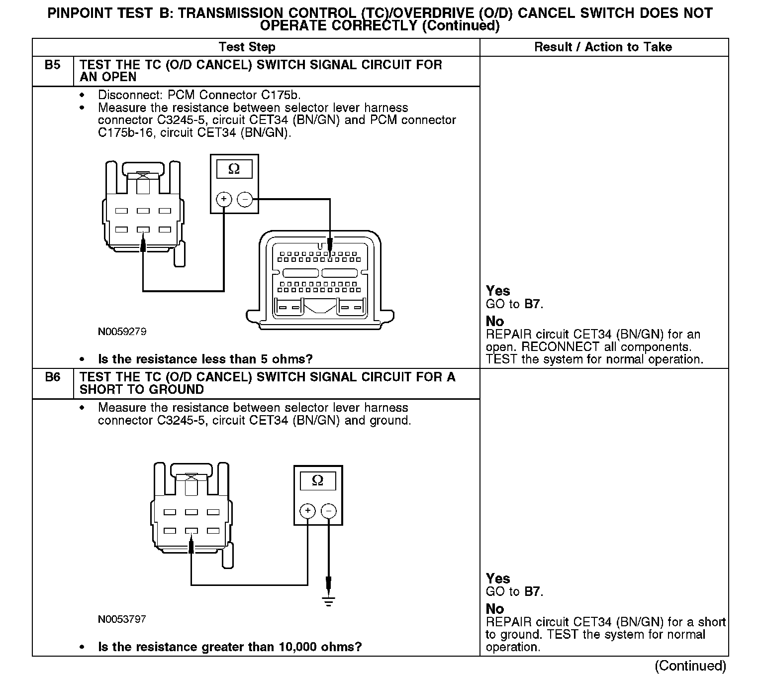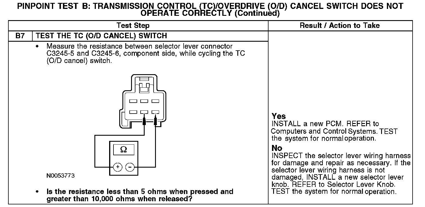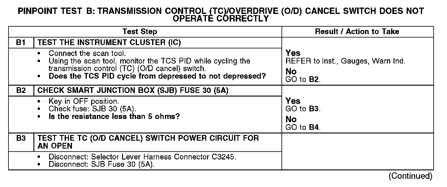 PINPOINT TEST B: TRANSMISSION CONTROL (TC)/OVERDRIVE (O/D) CANCEL SWITCH DOES NOT OPERATE CORRECTLY
