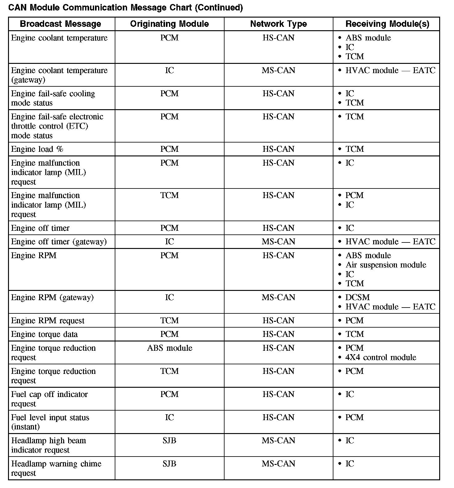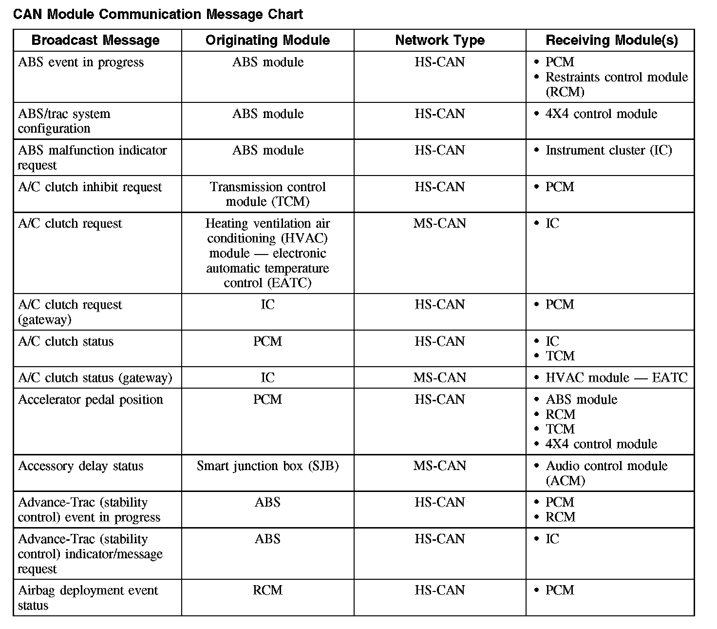 The following chart describes the specific CAN messages broadcast by each module, and the module(s) that receive the message:
