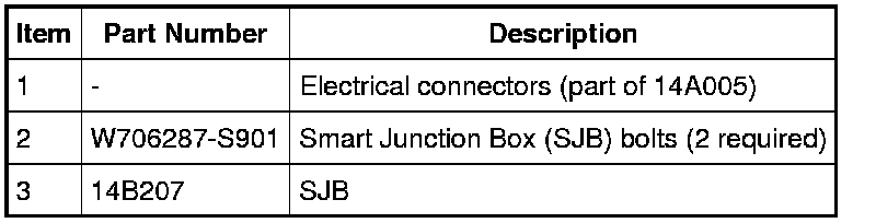 NOTE: Prior to the replacement of the module, it is necessary to upload the module configuration information to a scan tool. This information must be downloaded into the new Smart Junction Box (SJB) after installation. In the event that As-Built data entry is required (SJB will not communicate), all Remote Keyless Entry (RKE) devices must be programmed to the new SJB. A minimum of 2 devices are necessary to complete the configuration and turn off the flashing interior lights.