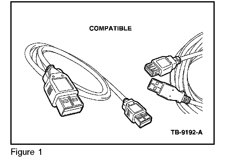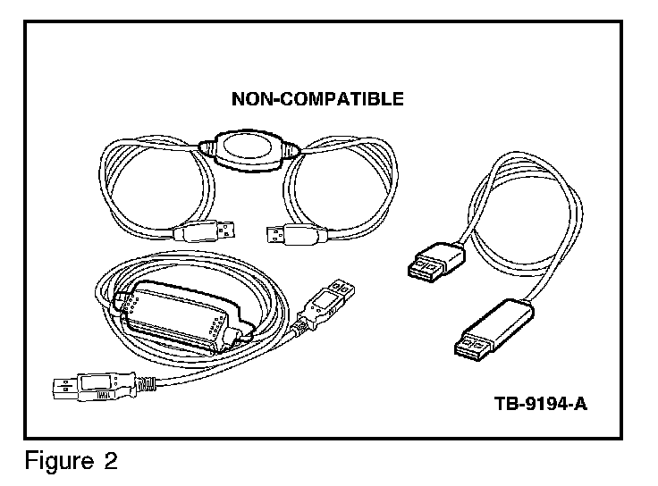 4. Connect one end of the USB male-A to male-A cable Rotunda part number CCMUSB2-AM-AM-10 (1-800-Rotunda option 6) or equivalent to the scan tool. Compatible cables. (Figures 1) Non-compatible cables. (Figure 2)