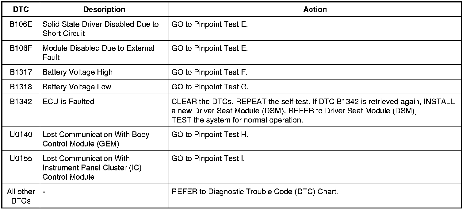 Driver Seat Module (DSM) DTC Chart