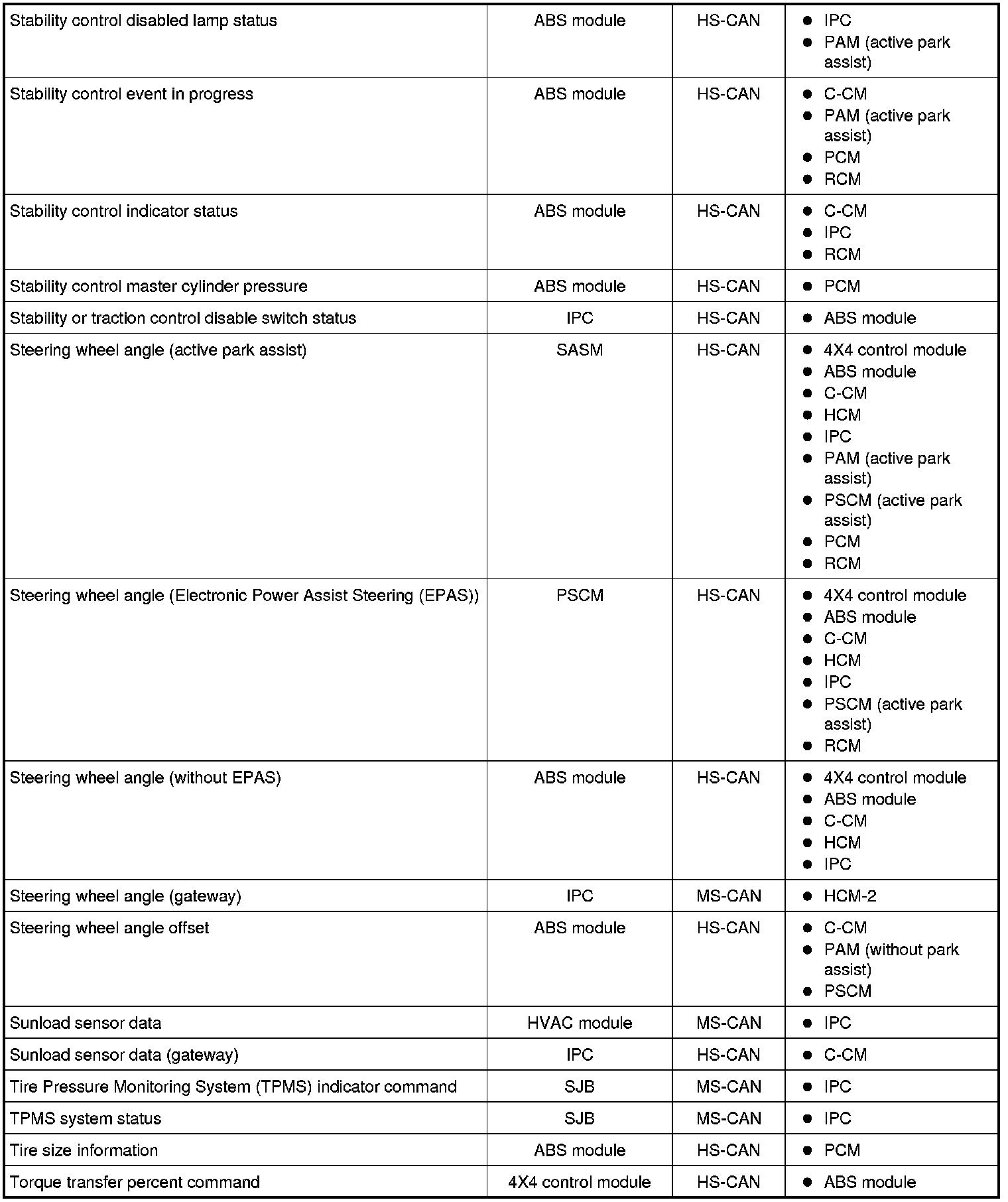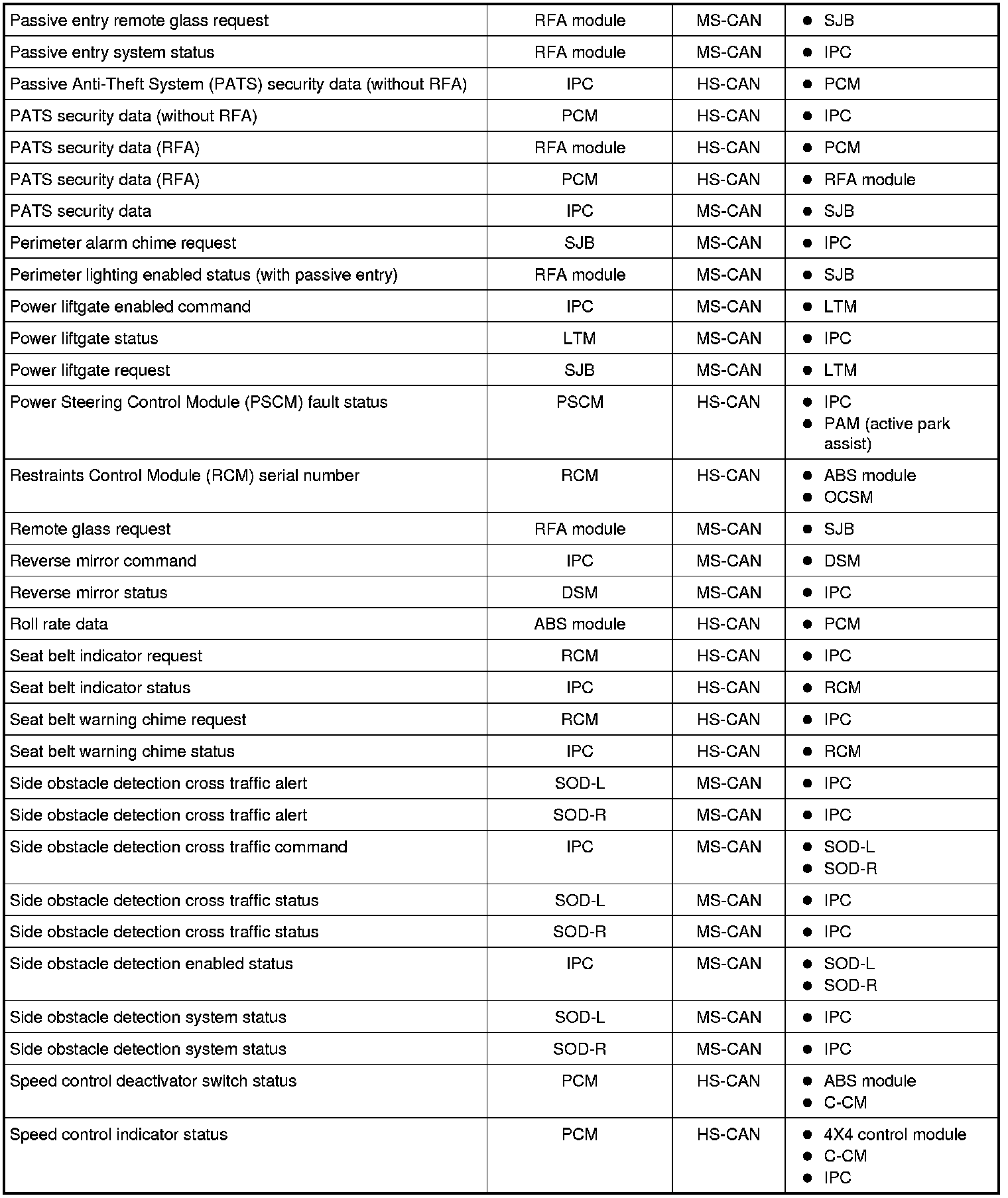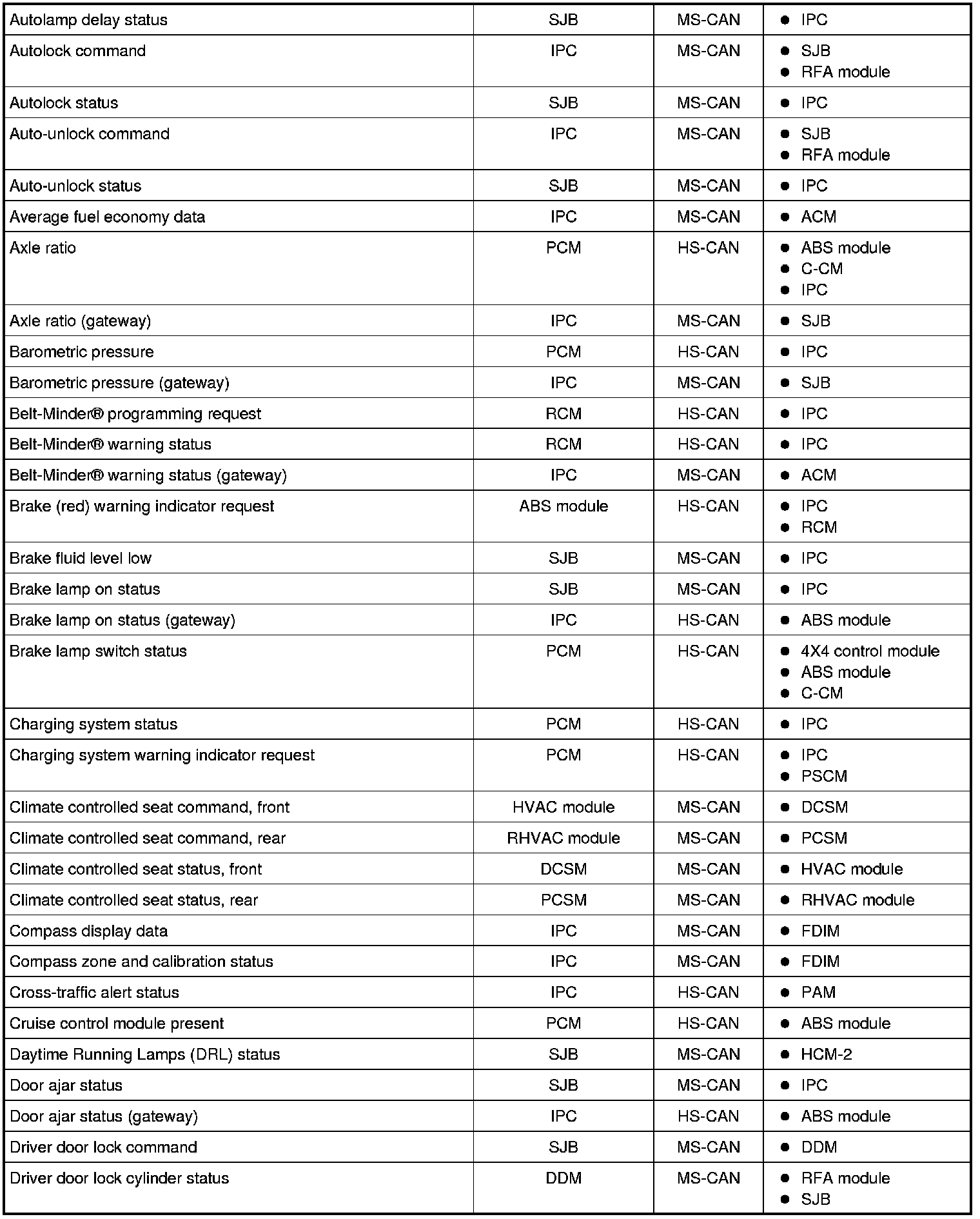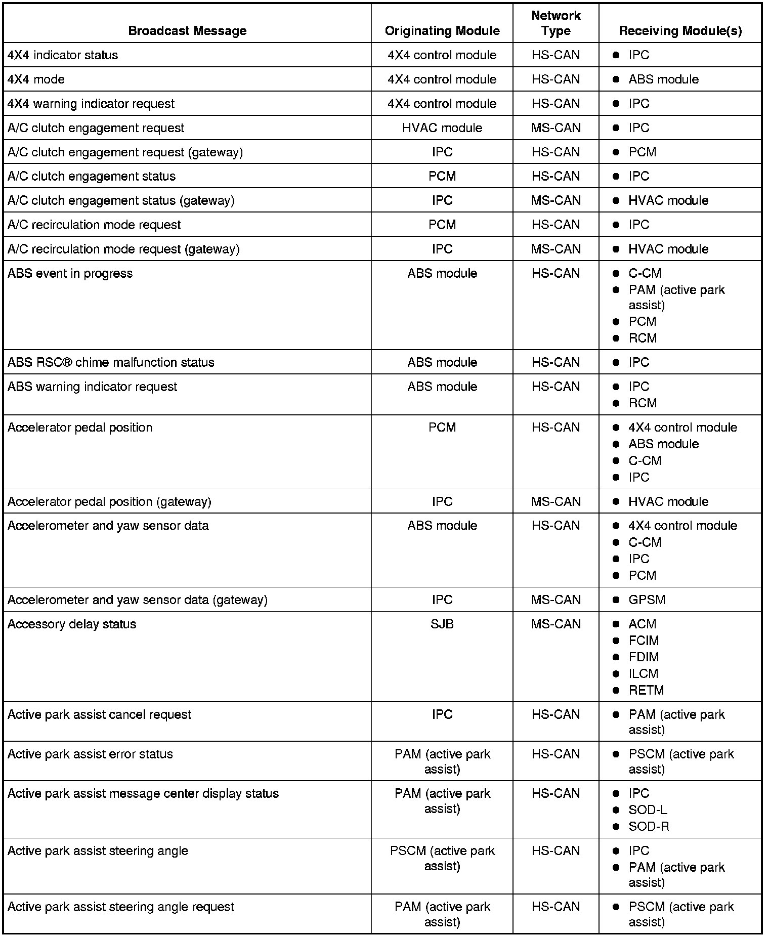 NOTE: This chart describes the specific HS-CAN and MS-CAN messages broadcast by each module, and the module(s) that receive the message.