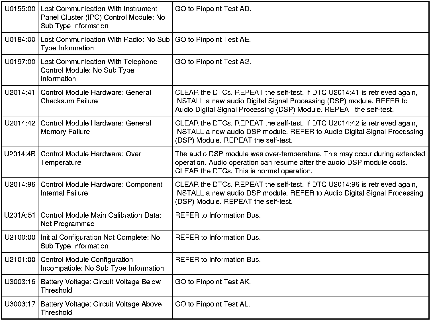 NOTE: This module utilizes a 5-character DTC followed by a 2-character failure-type code. The failure-type code provides information about specific fault conditions such as opens or shorts to ground. Continuous memory DTCs have an additional 2-character DTC status code suffix to assist in determining DTC history.